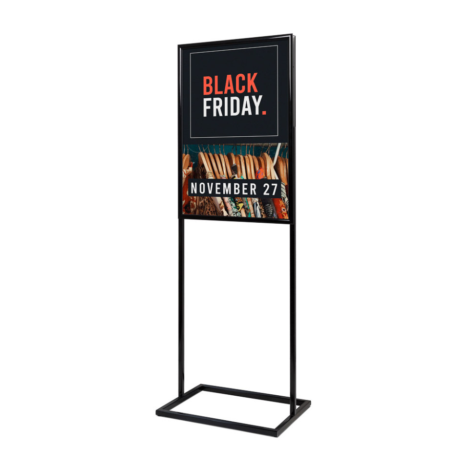 The double-sided stand features an intuitive snap frame design that allows users to insert posters easily by snapping the frame open. Simply align your A1-sized print, close the frame securely, and position the display in any desired location for immediate use!