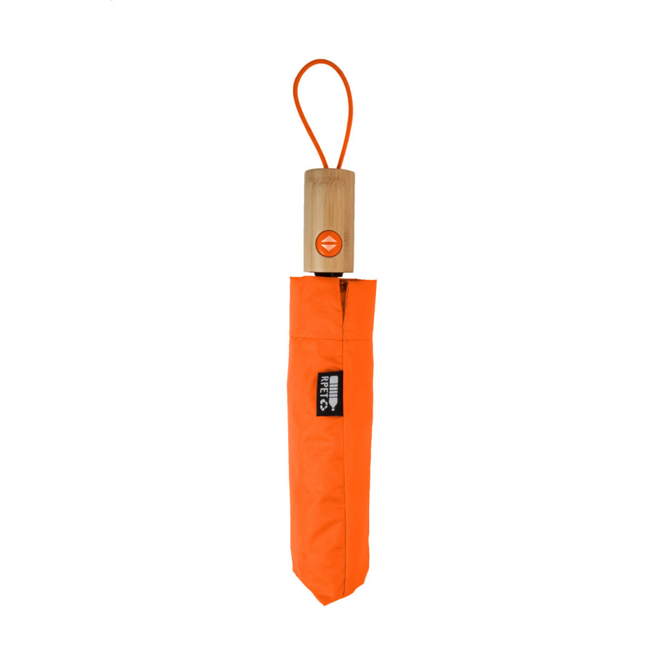 The Kasaboo orange RPET umbrella is a full automatic, windproof folding umbrella featuring 8 panels and a matching color pouch. It is designed for reliable protection and convenient use in various weather conditions.
