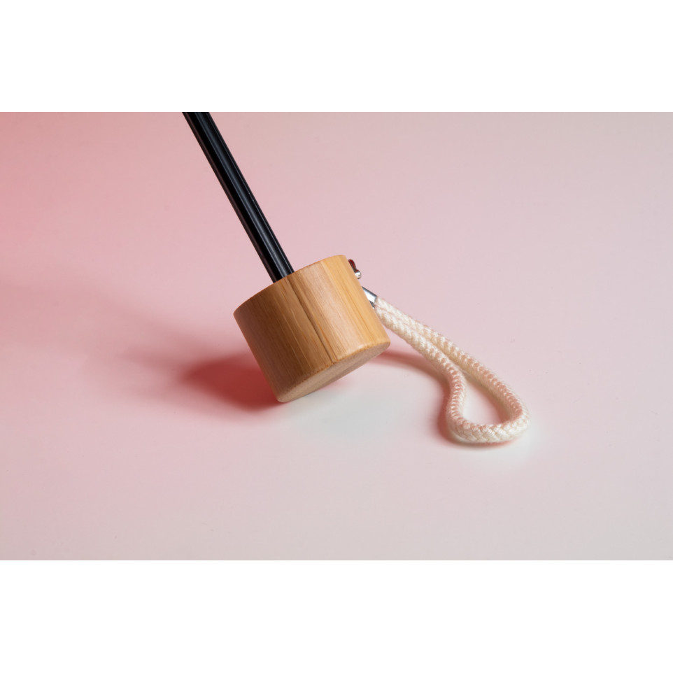 What are the umbrella's special design features? The Miniboo combines functionality with eco-conscious design, featuring a natural bamboo handle, cotton hand strap, and a matching color pouch.