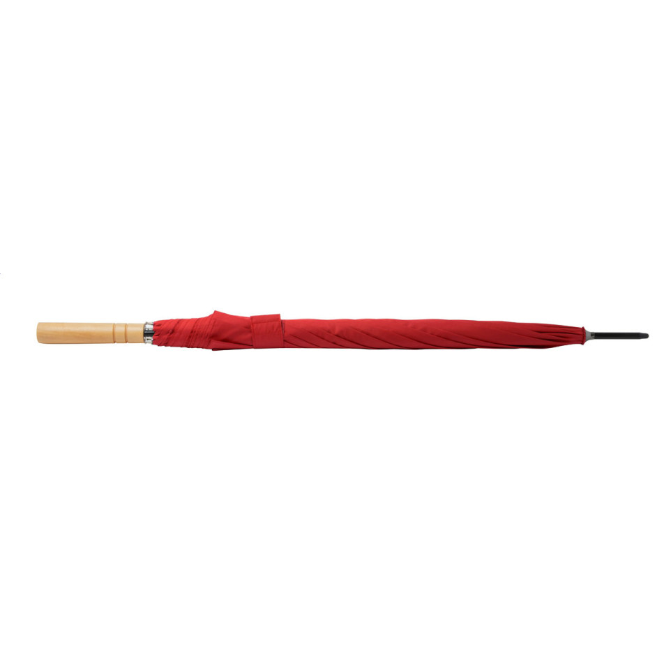 The Asperit red RPET umbrella is an automatic, windproof solution crafted with sustainability in mind. Featuring a classic wooden handle and robust construction, it offers reliable protection from the elements while showcasing eco-conscious design.