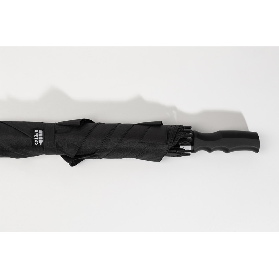 • Square design in 190T RPET pongee fabric with full fibreglass shaft and frame, rubberized ABS handle, and distinctive RPET label.