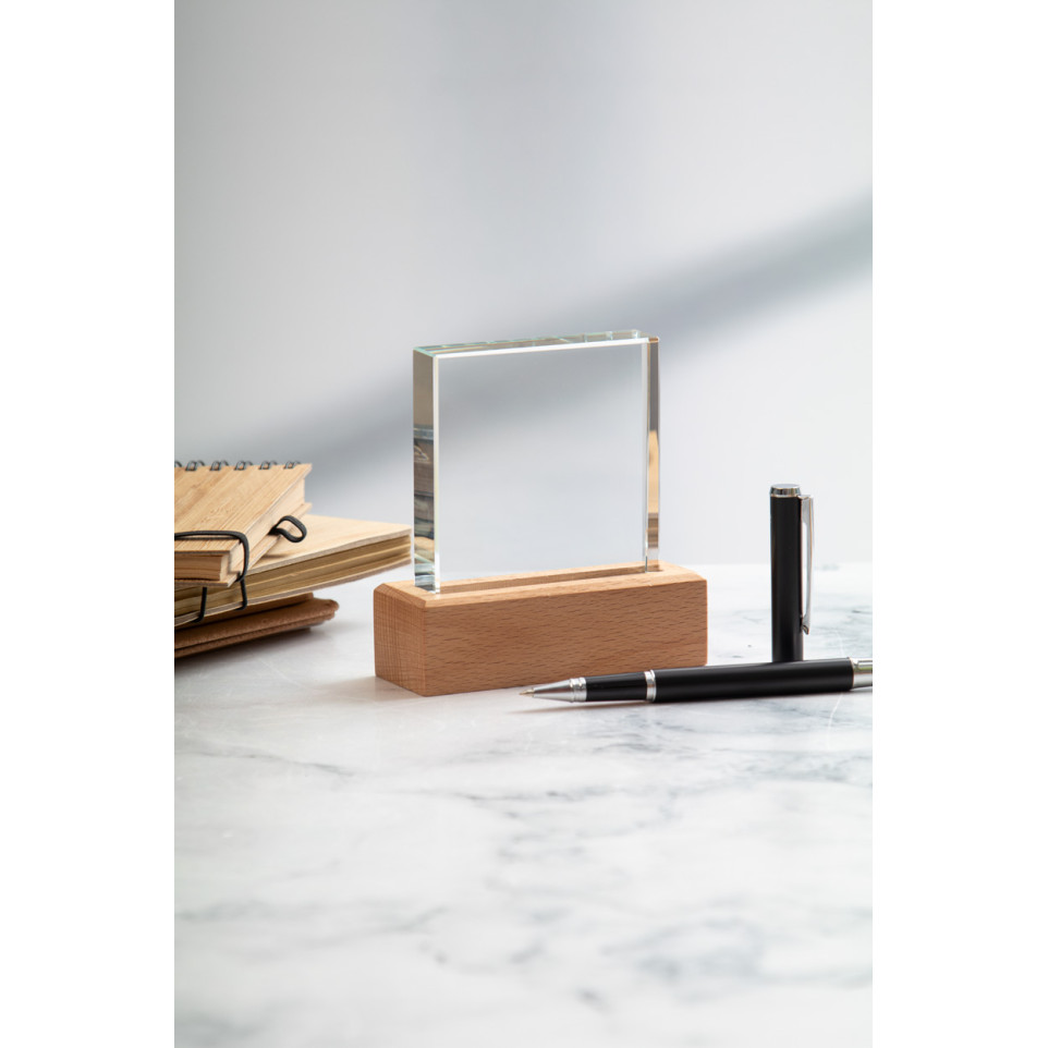 Elegant glass trophy with a beech wood base, presented in a kraft gift box. Its transparent design ensures a refined appearance for celebrating achievements, suitable for corporate awards, recognition ceremonies, or special events.