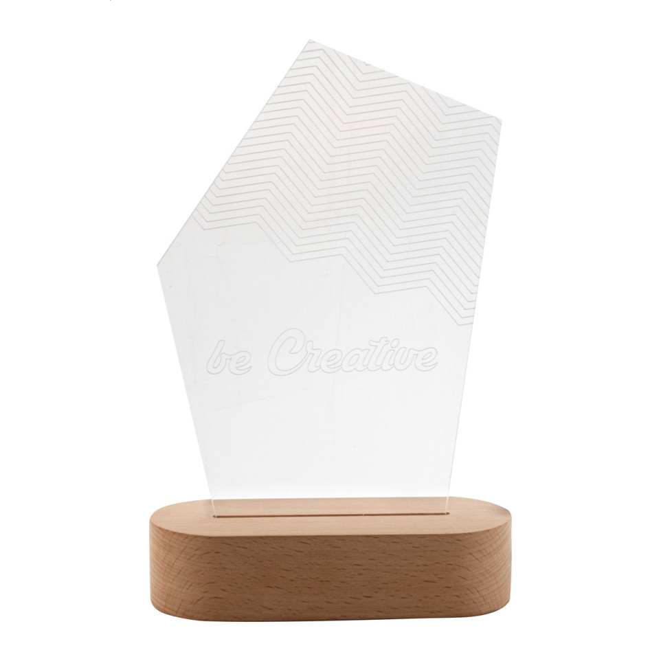 Custom made acrylic trophy on wooden base featuring a unique pentagon shape with integrated multicolor LED lighting. Perfect for recognizing achievements at corporate events, sports competitions, or special ceremonies.