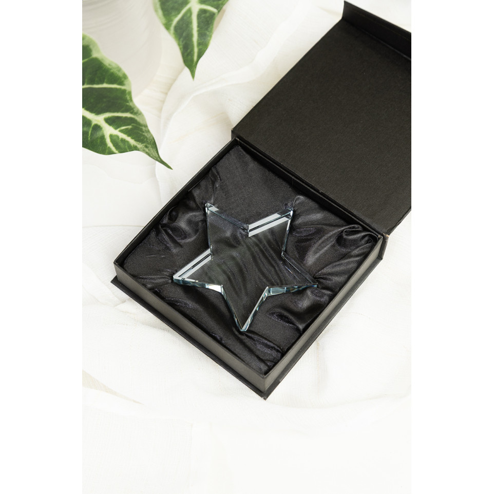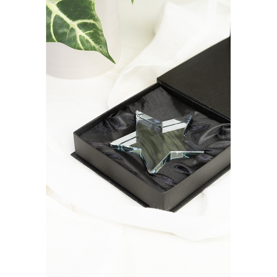 Transparent star-shaped crystal trophy presented in a black gift box, ideal for recognizing achievements in corporate or event settings.[12 words]
