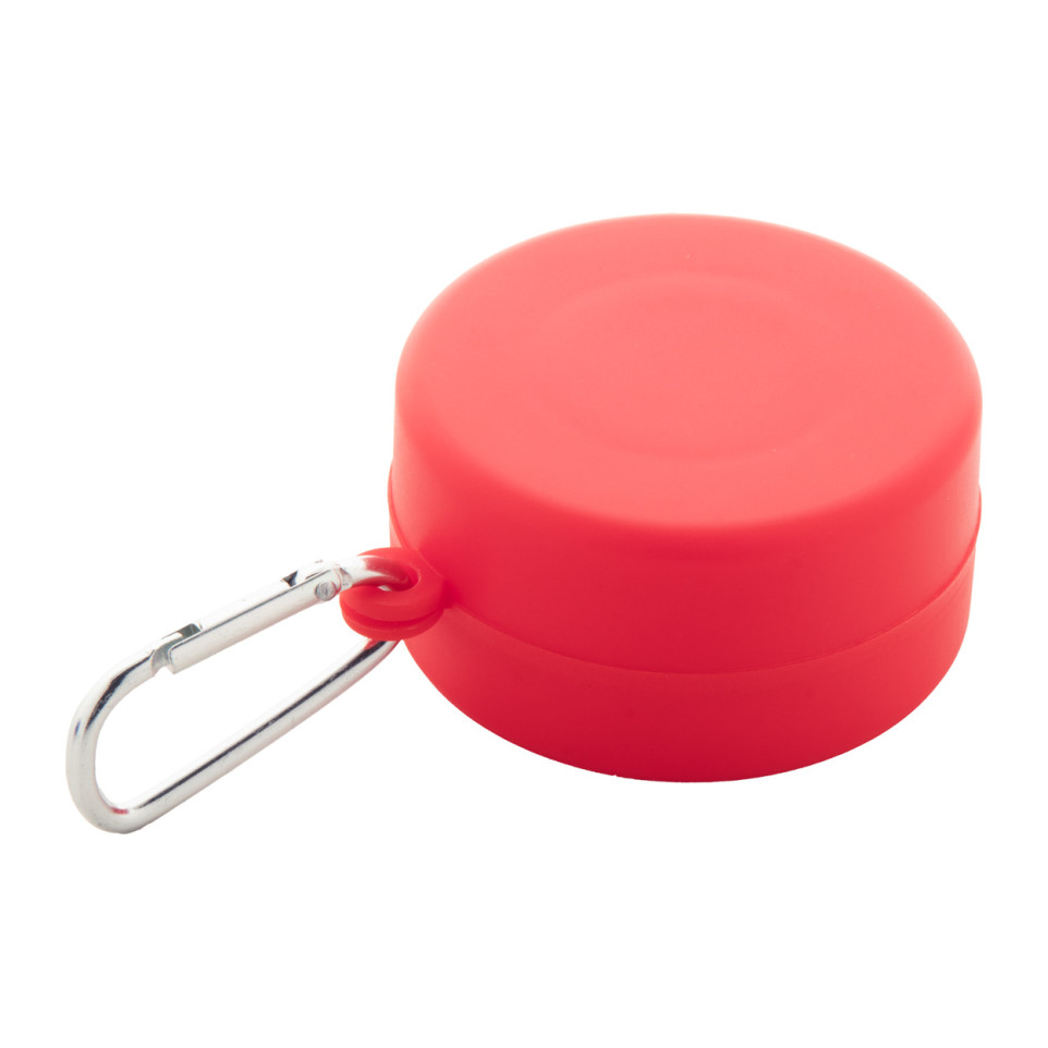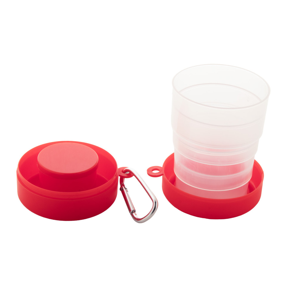 The Medigo red foldable cup is a practical 220ml portable drinking container featuring a pillbox compartment and metal carabiner for easy transport. Perfect for outdoor activities, travel, or daily commuting.