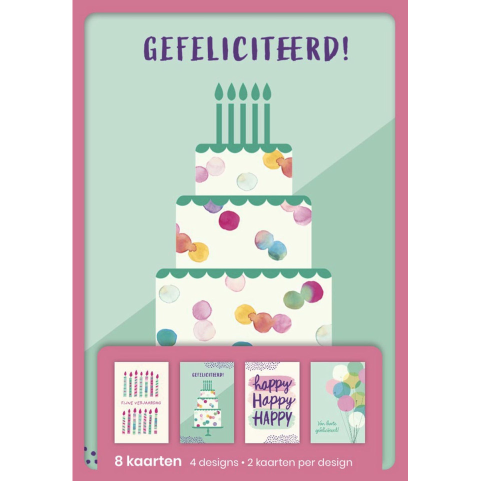 Pack of 8 premium Hallmark greeting cards for congratulations, featuring 4 distinct designs (2 cards per design) in Dutch. Each card comes with a matching envelope and is neatly presented in a blister pack, ideal for various celebratory occasions.