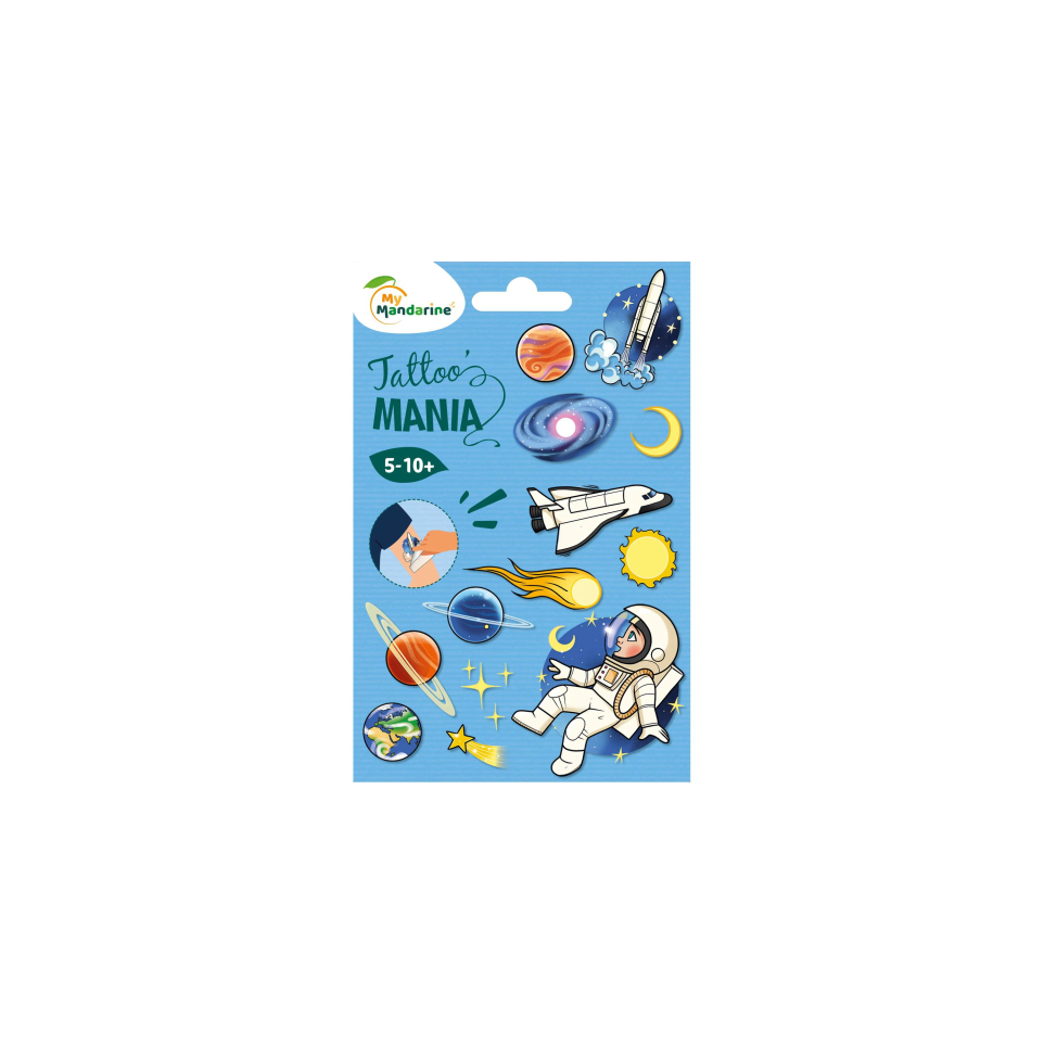 Tattoo Mania, Space Cut out a design, remove the protective sheet, apply the design to your child's skin, rub for 30 seconds and there you have your child tattooed like a grown-up. Colourful, original patterns that your child will like. Step by step included. Complies with CE standards - From 5 years old. 1 board 10.5x16 cm with 16 tattoos.