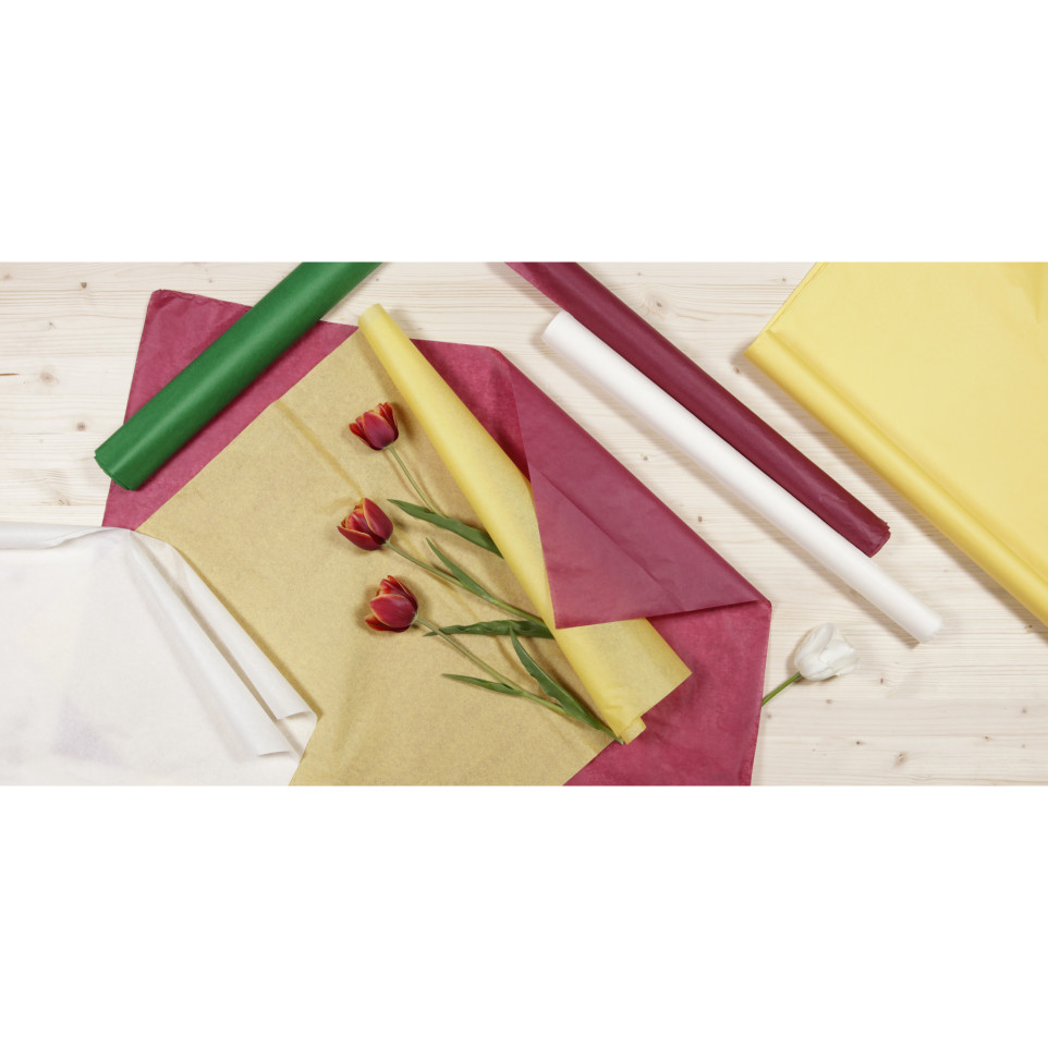 PAPIER DE SOIE, Rouleau de 24 feuilles 18g/m2 au format 50x75cm Essentiellement utilisé pour l'emballage, le papier de soie convient également aux activités créatives. D'une grande finesse et délicatesse, il apporte douceur, élégance, fluidité et offre de jolis effets de transparence. Un rouleau de 24 feuilles de papier de soie 18g/m2 au format 50x75cm et au pli de 7.5cm. La couleur est résistante à l'eau et le papier sans acide,