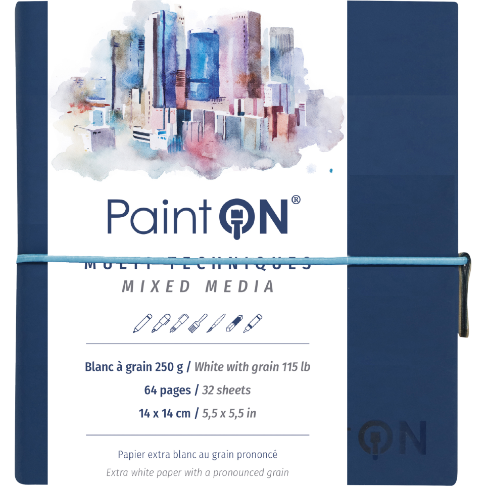 PaintON à Grain carnet cousu 32F 14x14cm 250g Papier épais 100% cellulose, multi-technique par excellence. Un carnet de qualité aux finitions soigneusement travaillées : une couverture souple et agréable au toucher, un élastique rond et une tirette pour une parfaite fermeture. Adapté aux techniques sèches (crayon, stylo graph, feutre) et aux techniques humides (encre de Chine, gouache, acrylique). Un carnet dédié aux grands artistes voyageurs, urban sketchers et autres illustrateurs. Excellente capacité d'absorption et repentir possible.