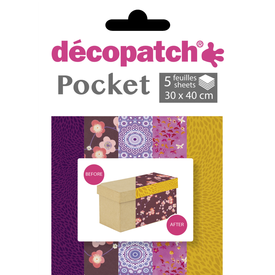 Décopatch Pocket collection n°5 Decopatch Pocket Paper Packs, Assorted Designs Create an unique decoration that exactly matches your tastes, your desires, your needs with this assortment pack of papers Decopatch paper can be laid over any flat or uneven surfaces Every little piece of paper can be used The paper dose not tear or lose colour when used with glue or varnish Each pocket contains 5 Decopatch sheets 30x40cm. This handy size is very useful: they can be taken anywhere MULTI-SURFACE PAPER: Décopatch paper perfectly moulds to the shape of all objects (flat or irregular) and on all materials (papier-mâché, wood, plastic, iron, glass, polystyrene, metal, terracotta, ceramic, cork, etc.) . PERFECT FINISH: Very easy to apply thanks to its smoothness and its resistance once glued, Décopatch paper is the only paper to give a smooth appearance and gives the illusion of painting to your creations! ECOLOGICAL: Décopatch allows you to give life to an old piece of furniture, to modernise old treasures, to create an original object for a birthday, a wedding . SIMPLE TECHNIQUE: tear or cut a few pieces of Decopatch paper of about 2x2 cm - Apply the PaperPatch glue varnish (not supplied) on the item to be decorated. Place a piece of paper on the glued surface and put a second coat of glue varnish on top. Repeat the operation by superimposing the pieces of paper until the object is completely or partially covered.