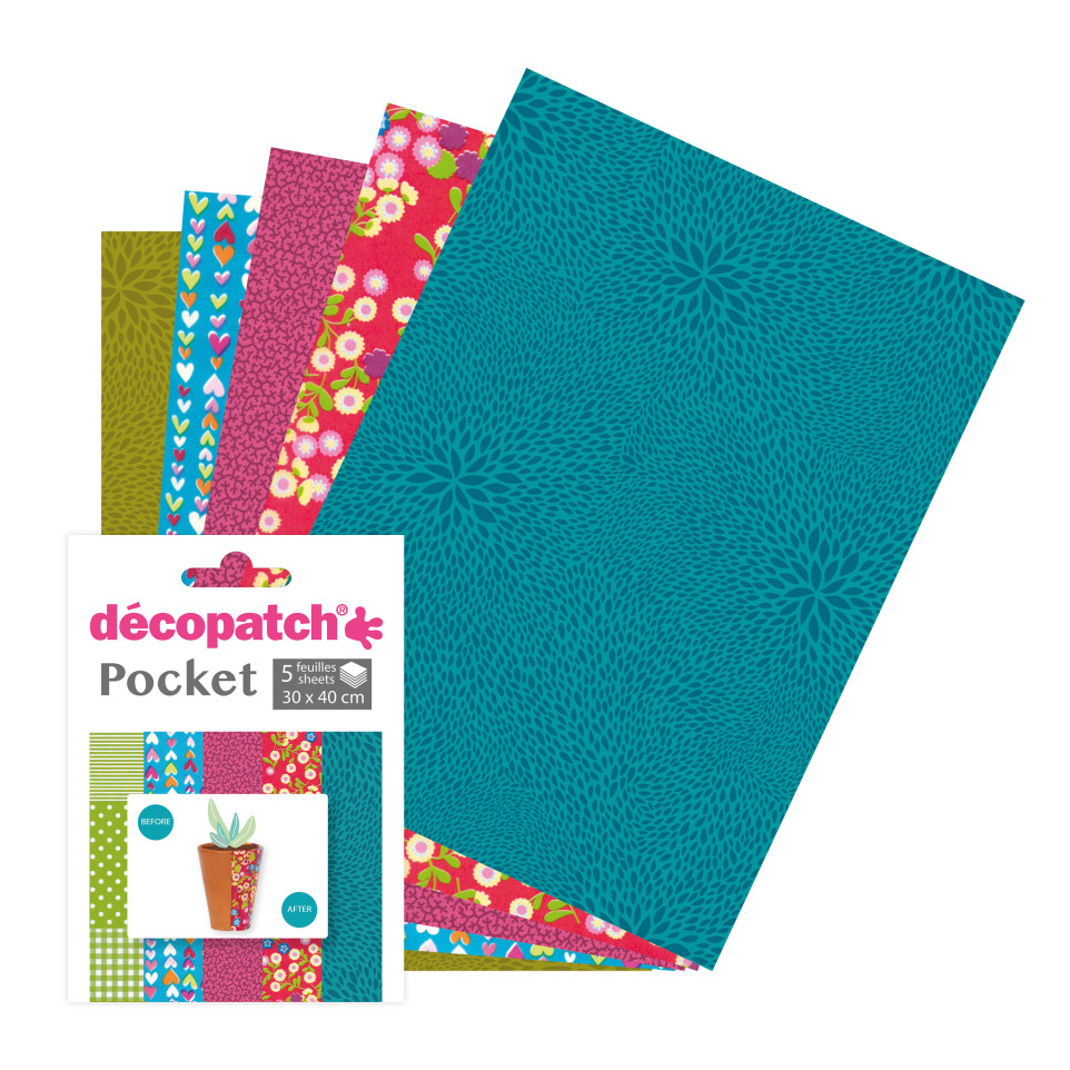 Décopatch Pocket collection n°6 Decopatch Pocket Collection Paper No6, Assortment Create an unique decoration that exactly matches your tastes, your desires, your needs with this assorted papers Decopatch paper can be laid over any flat or uneven surfaces Every little piece of paper can be used The paper dose not tear or lose colour when used with glue or varnish Each pocket contains 5 Decopatch sheets 30x40cm. This handy size is very useful: they can be taken anywhere MULTI-SURFACE PAPER: Décopatch paper perfectly moulds to the shape of all objects (flat or irregular) and on all materials (papier-mâché, wood, plastic, iron, glass, polystyrene, metal, terracotta, ceramic, cork, etc.) . PERFECT FINISH: Very easy to apply thanks to its smoothness and its resistance once glued, Décopatch paper is the only paper to give a smooth appearance and gives the illusion of painting to your creations! ECOLOGICAL: Décopatch allows you to give life to an old piece of furniture, to modernise old treasures, to create an original object for a birthday, a wedding . SIMPLE TECHNIQUE: tear or cut a few pieces of Decopatch paper of about 2x2 cm - Apply the PaperPatch glue varnish (not supplied) on the item to be decorated. Place a piece of paper on the glued surface and put a second coat of glue varnish on top. Repeat the operation by superimposing the pieces of paper until the object is completely or partially covered.