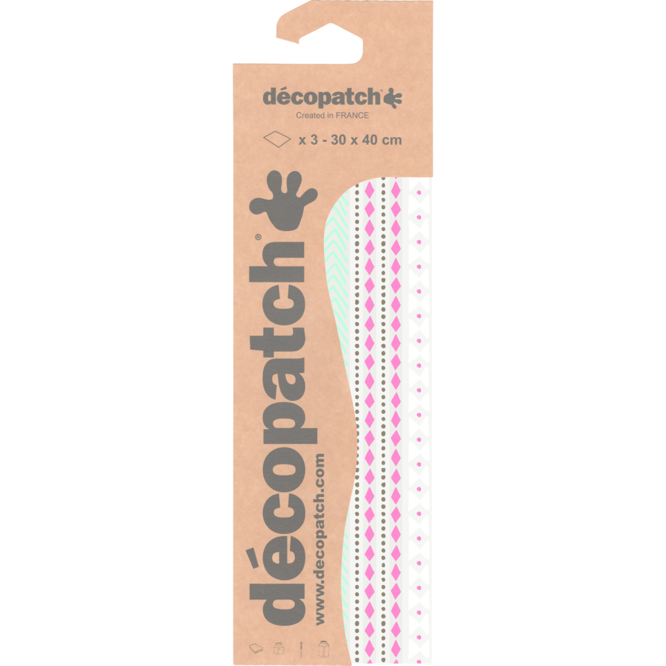 3 Décopatch sheets réf. 715 MULTI-SURFACE PAPER: Décopatch paper perfectly moulds to the shape of all objects (flat or irregular) and on all materials (papier-mâché, wood, plastic, iron, glass, polystyrene, metal, terracotta, ceramic, cork, etc.) . PERFECT FINISH: Very easy to apply thanks to its smoothness and its resistance once glued, Décopatch paper is the only paper to give a smooth appearance and gives the illusion of painting to your creations! ECOLOGICAL: Décopatch allows you to give life to an old piece of furniture, to modernise old treasures, to create an original object for a birthday, a wedding . SIMPLE TECHNIQUE: tear or cut out a few pieces of Decopatch paper of approximately 2x2 cm - Apply the PaperPatch varnish-glue (not supplied) to the surface to be decorated. Lay a piece of paper on the glued surface and put a second coat of glue over it. Repeat by overlapping the pieces of paper until the object is completely or partially covered.