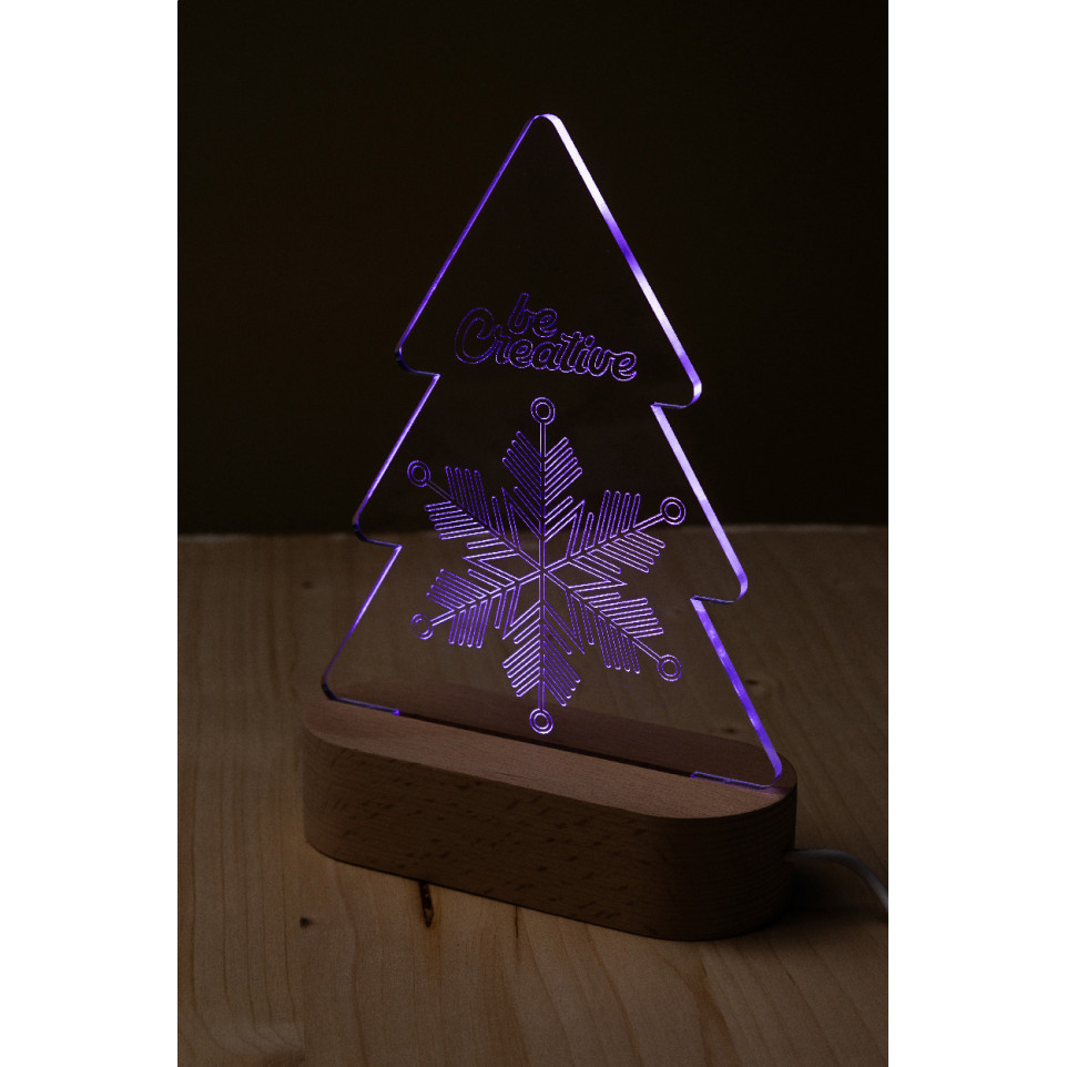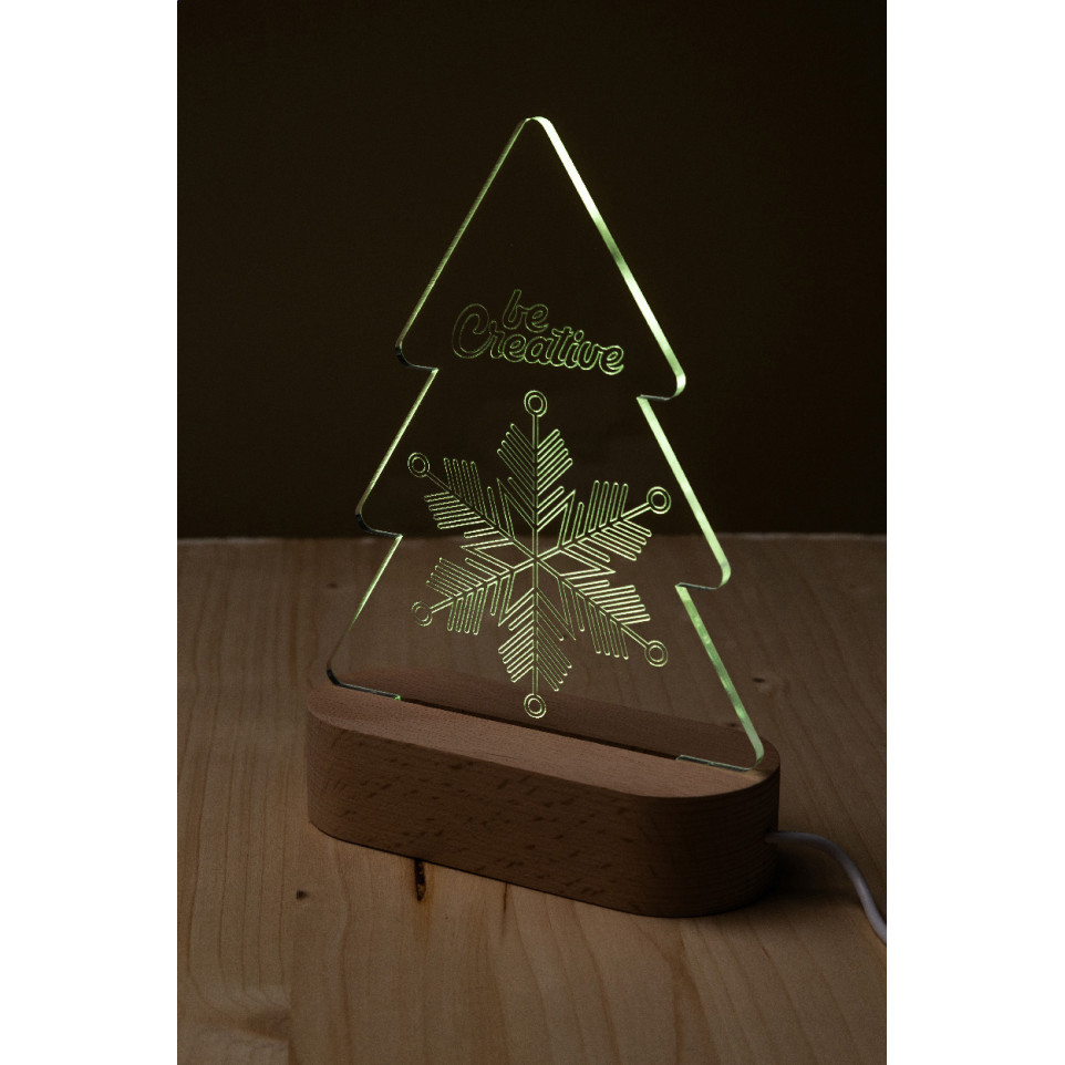 Customizable Christmas tree-shaped acrylic trophy set on a natural wooden base, featuring USB-powered multicolour LED lighting. Ideal as a festive desk accessory, gift, or seasonal event award.