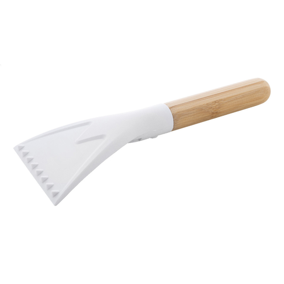 The scraper is produced using recycled ABS plastic and a bamboo handle for sustainable construction.
