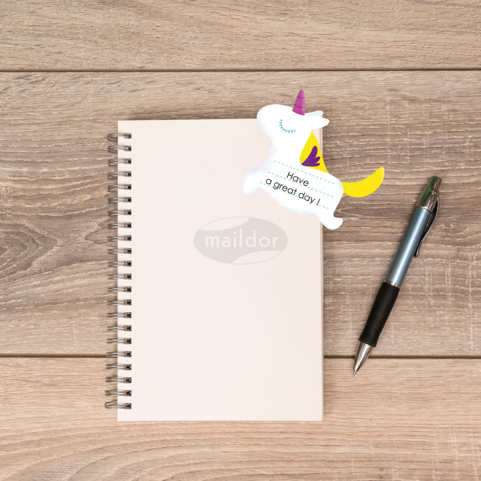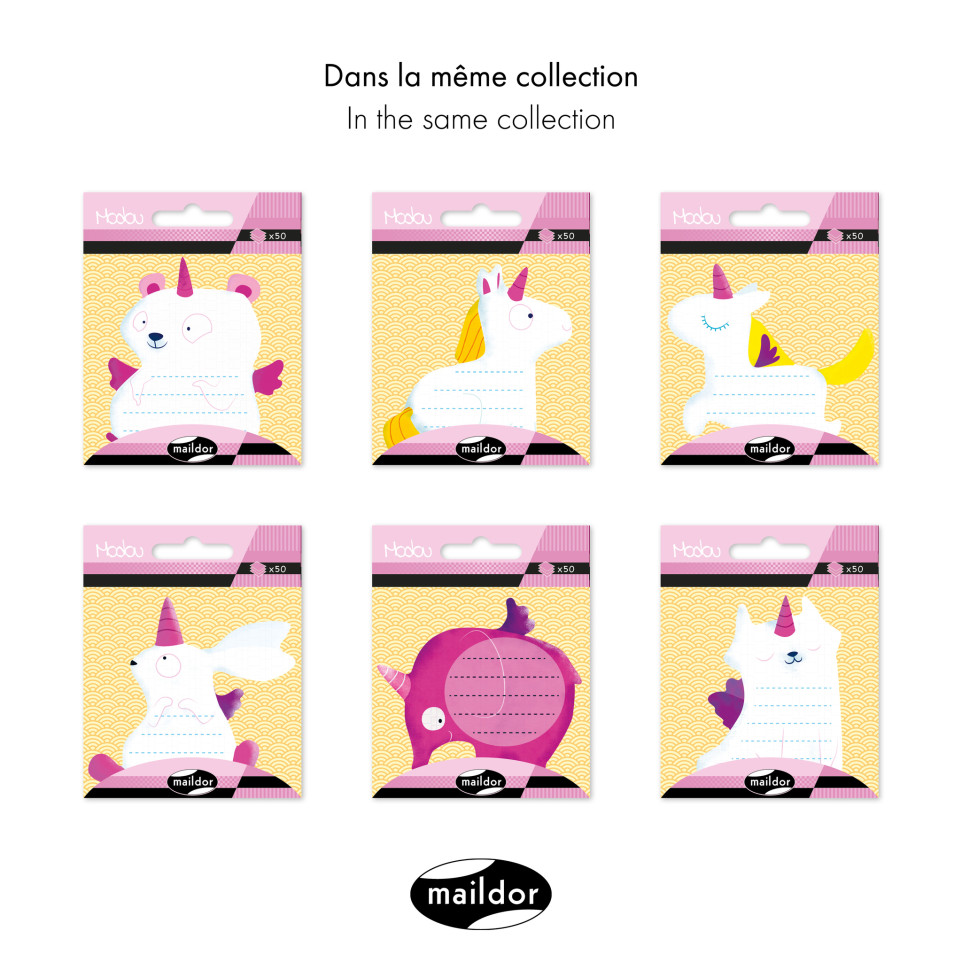 Modou, Licorne Un petit bloc rigolo qui devient mémo, pense-bête, petit mot, becquet ou marque-page, c'est Modou ! Feuilles auto-adhésives repositionnables déjà si familières que vous en collerez vite partout ! RV, petits message, informations importantes? Voici un support adhésif coloré et joyeux à coller sur un frigo, un dossier, un livre.... Il vous deviendra vite indispensable : posé près du téléphone, il vous permettra de noter un message. N'oubliez plus rien et inscrivez votre liste de course au fur et à mesure de vos besoins. Il vous permettra aussi de garder un lien avec votre famille : un petit message coloré pour rappeler les choses importantes pendant votre absence. Dimensions du mémo : 6x7 cm.