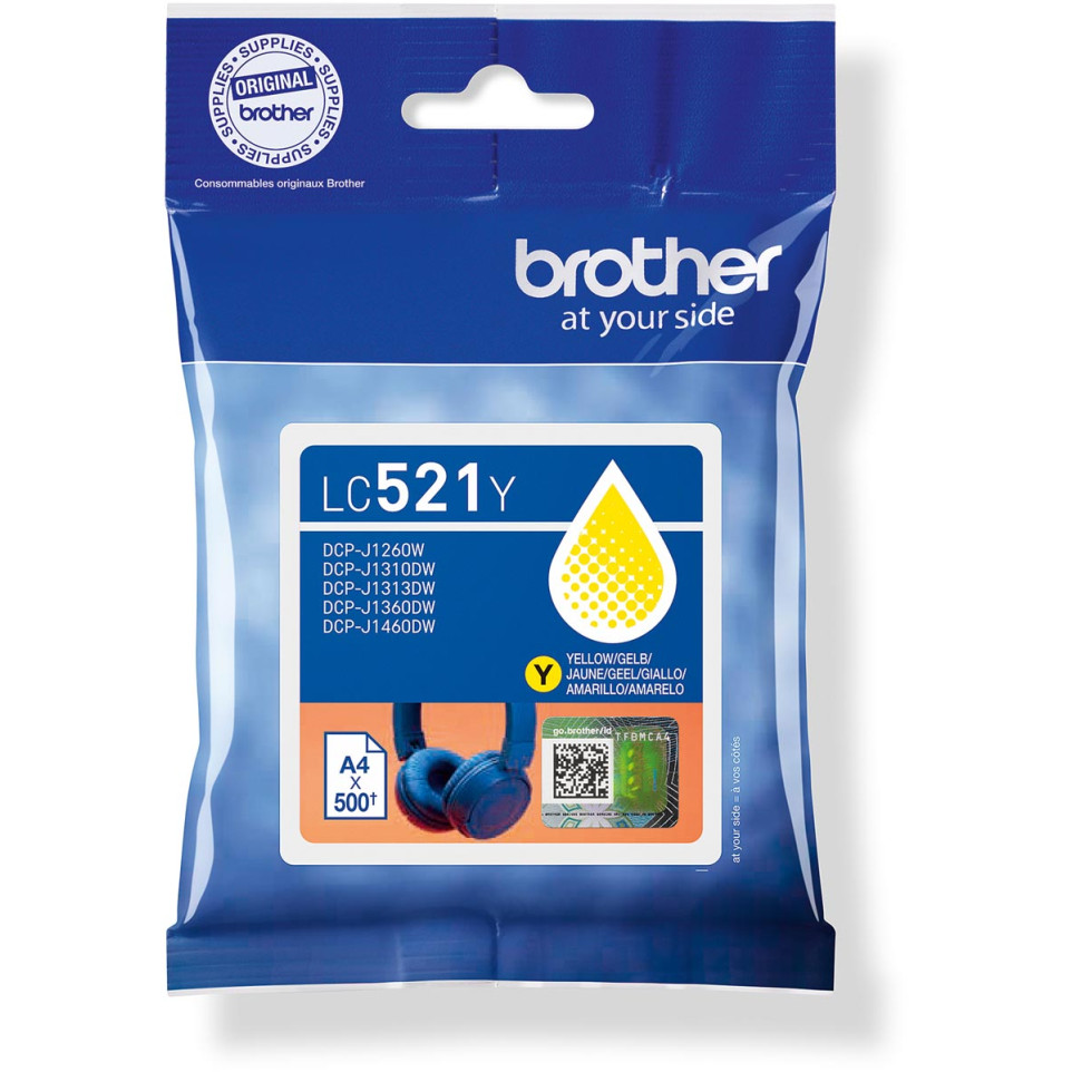 Original Brother LC-521Y yellow ink cartridge designed for the DCP-J1260W and DCP-J1310DW inkjet printers. Provides reliable, consistent color output, suitable for both home and office document printing needs.