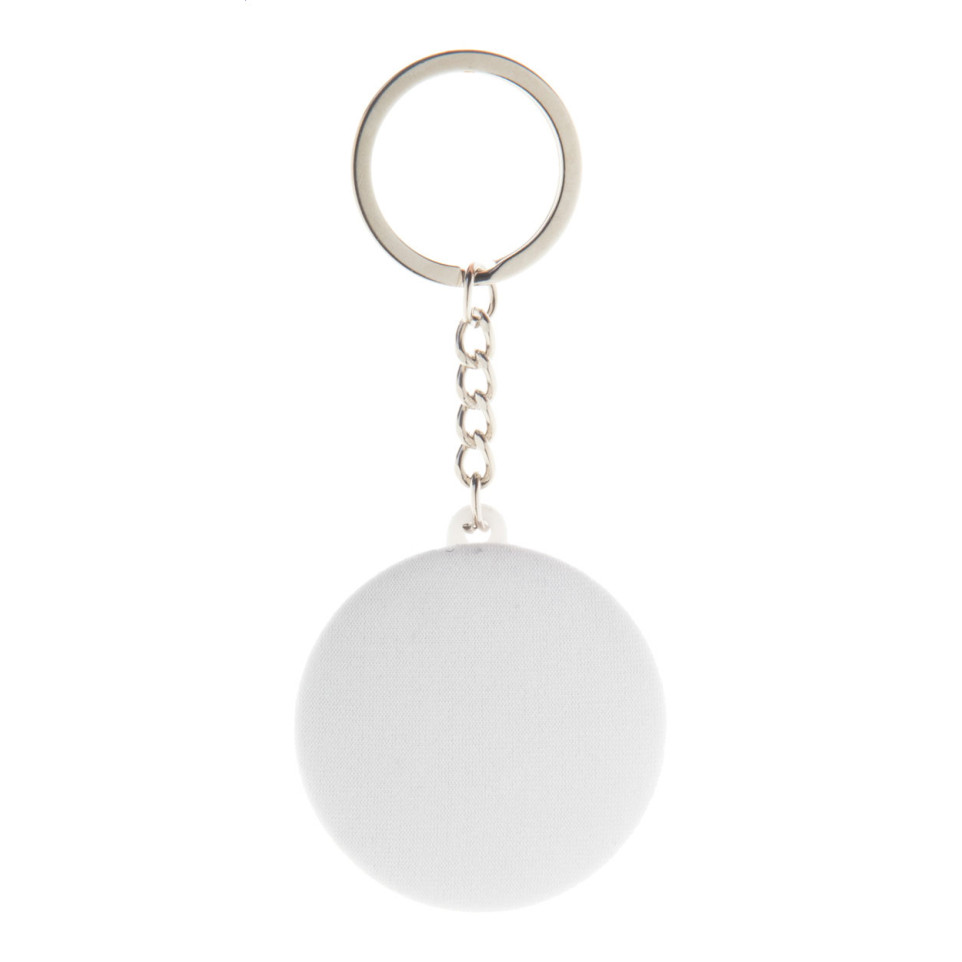 Compact pin button keyring featuring a white RPET microfibre cover fully customizable with your design. Ideal for everyday use or promotional giveaways, its small form factor makes it practical for carrying keys or adding a branded touch to bags and accessories.