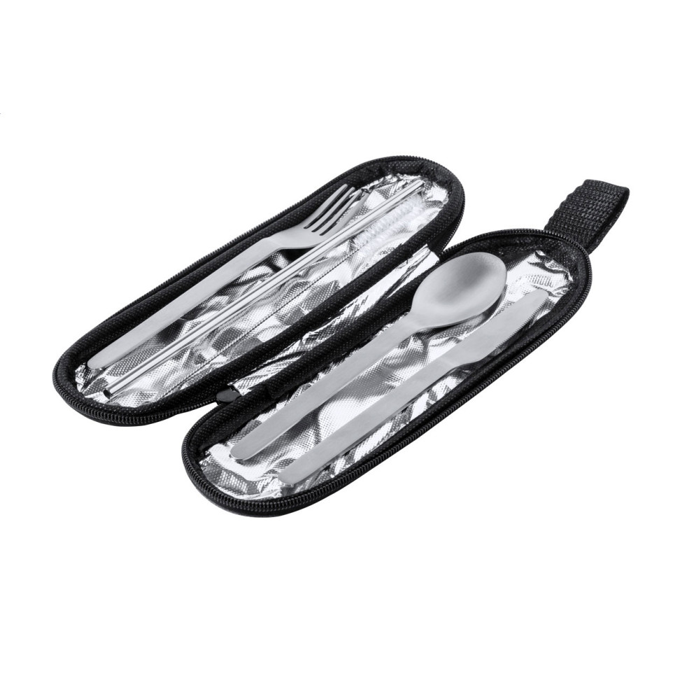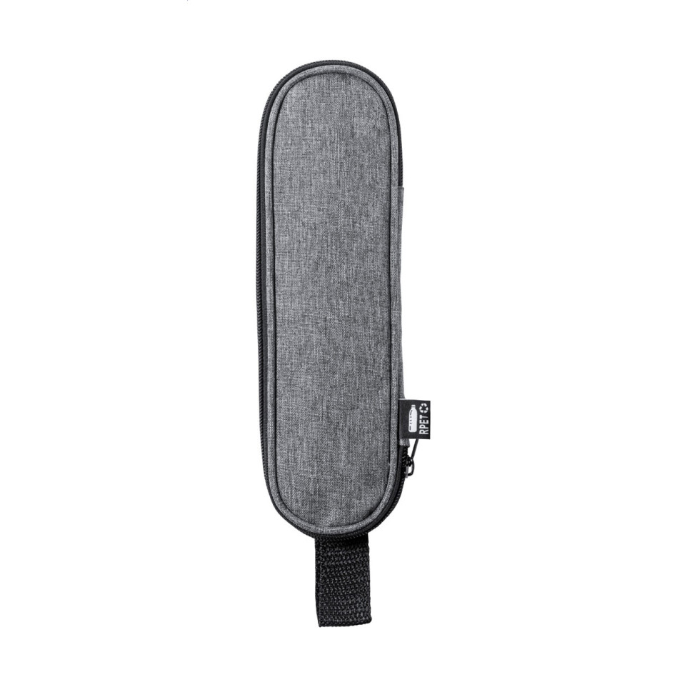 Practical and portable, the Sullery grey cutlery set offers five essential stainless steel utensils—fork, knife, spoon, drinking straw, and cleaning brush—neatly stored in a reusable RPET polyester pouch, ideal for meals at work, picnics, or on-the-go.