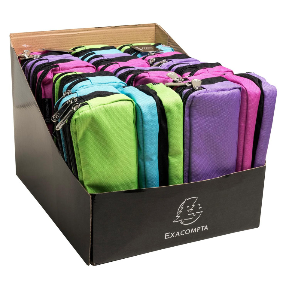 Exacompta Rectangle Pencil Case 3 Compartments Assorted Durable and brightly coloured polyester pencil cases with 3 compartments for storing and transporting pens, pencils, erasers and ot her accessories, Compact size with a large capacity ideal for use at school, college or at home. Rectangle design with 3 separate compartments providing plenty of storage space, Stores pens and pencils along with scissors, small rulers and a compass, Strong, lightweight and wipe clean material with 3 zip closures to keep contents secure. Can be used by children or adults to store stationery sets ready for exams, as a travel bag for makeup or to organise small toys and games, Gift as a boys or girls birthday or Christmas present along with drawing or colouring pens. Keep all your daily essentials stored in one compact pen case, Easy to transport in a bag or rucksack and fits neatly on a desk or in a drawer for storage, Use the compartments to separate pens and accessories making them easier to find. Display box of 13 pen cases with 2 tricolour designs. Assorted colours, colours may vary. Fully lined with polyester to protect the contents, These special pencil cases measure 22 x 8.5 x 9cm.