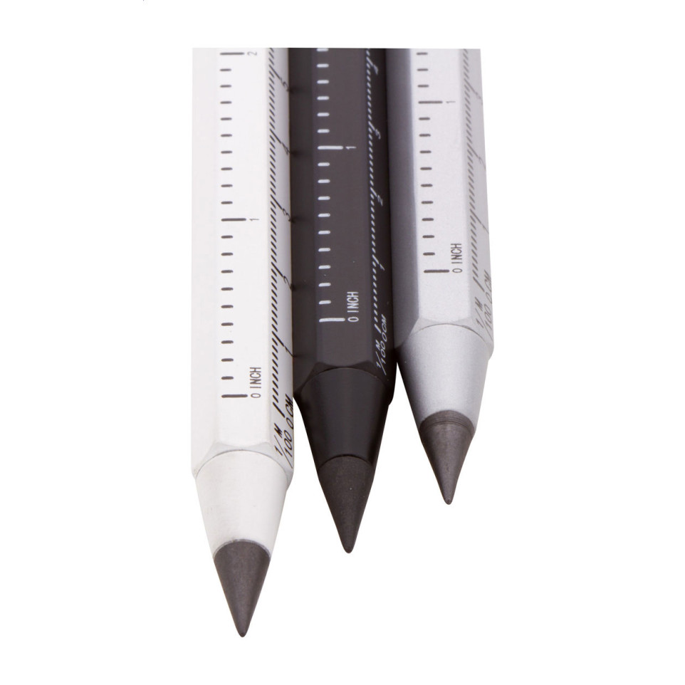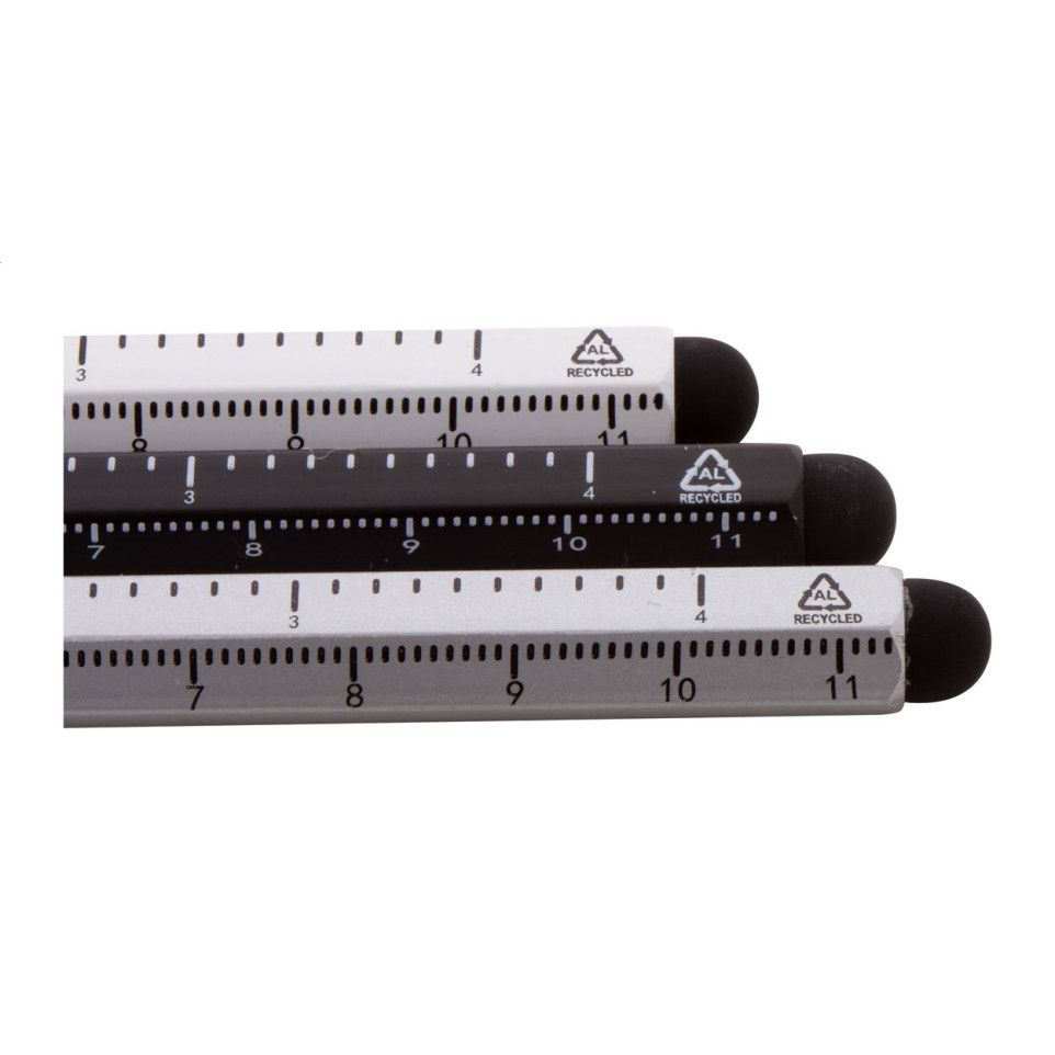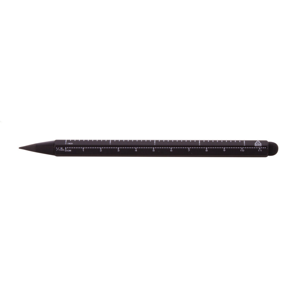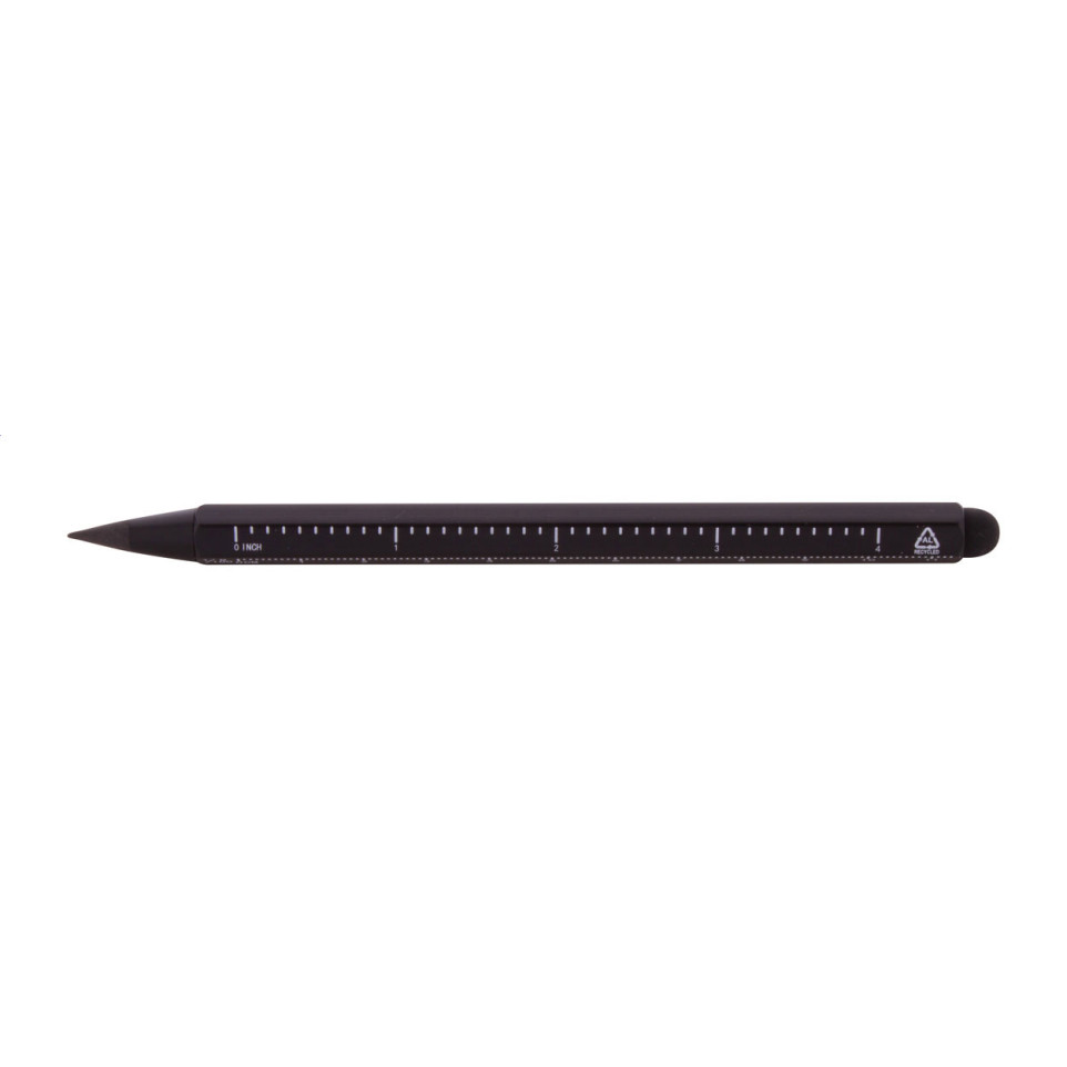 The Ruloid black inkless pen with ruler is a versatile writing tool made from recycled aluminium, featuring an erasable metal alloy tip that oxidizes paper to produce marks. It includes a built-in 11 cm and 4-inch ruler, a stylus tip for touchscreen use, and a hexagonal barrel for a comfortable grip.
