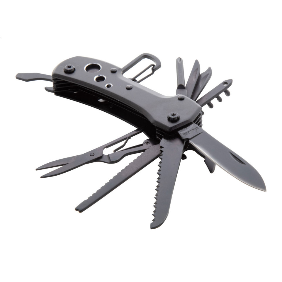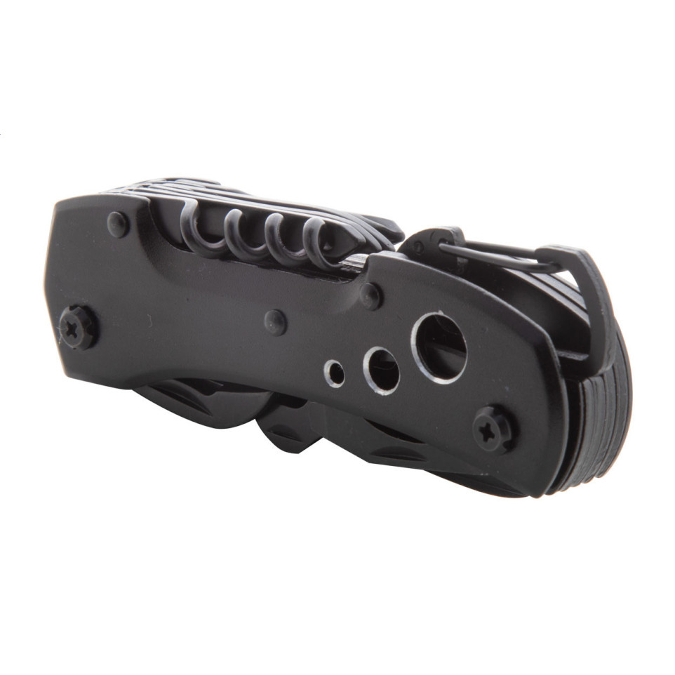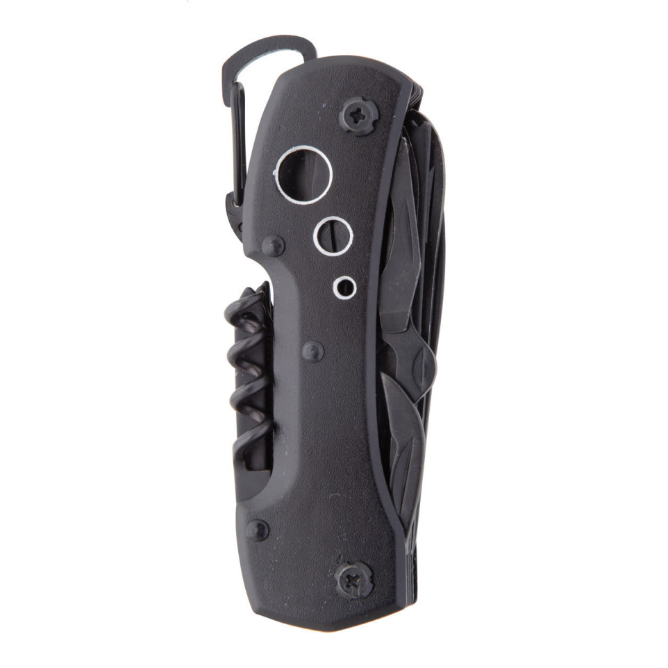 The Galloway black multifunctional pocket knife is a compact, all-black tool featuring 13 practical functions with a sleek aluminum handle and convenient carabiner attachment, making it ideal for outdoor adventures and everyday tasks.