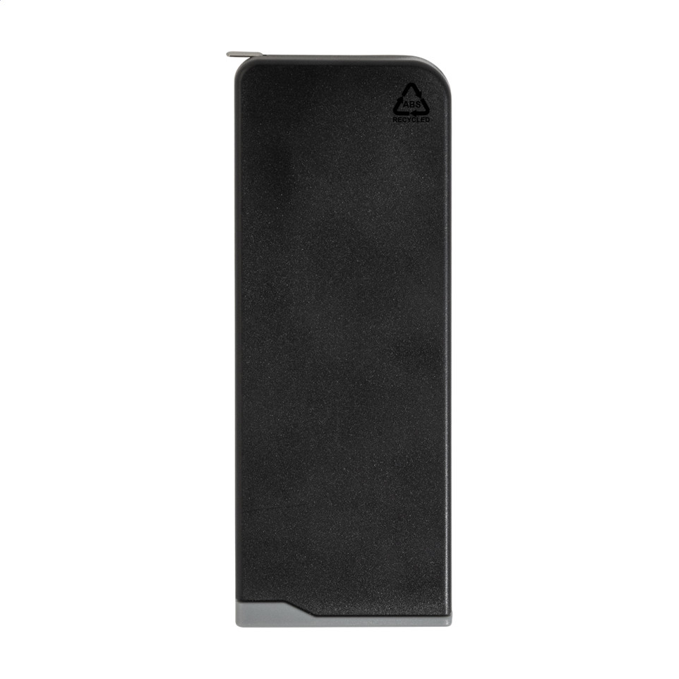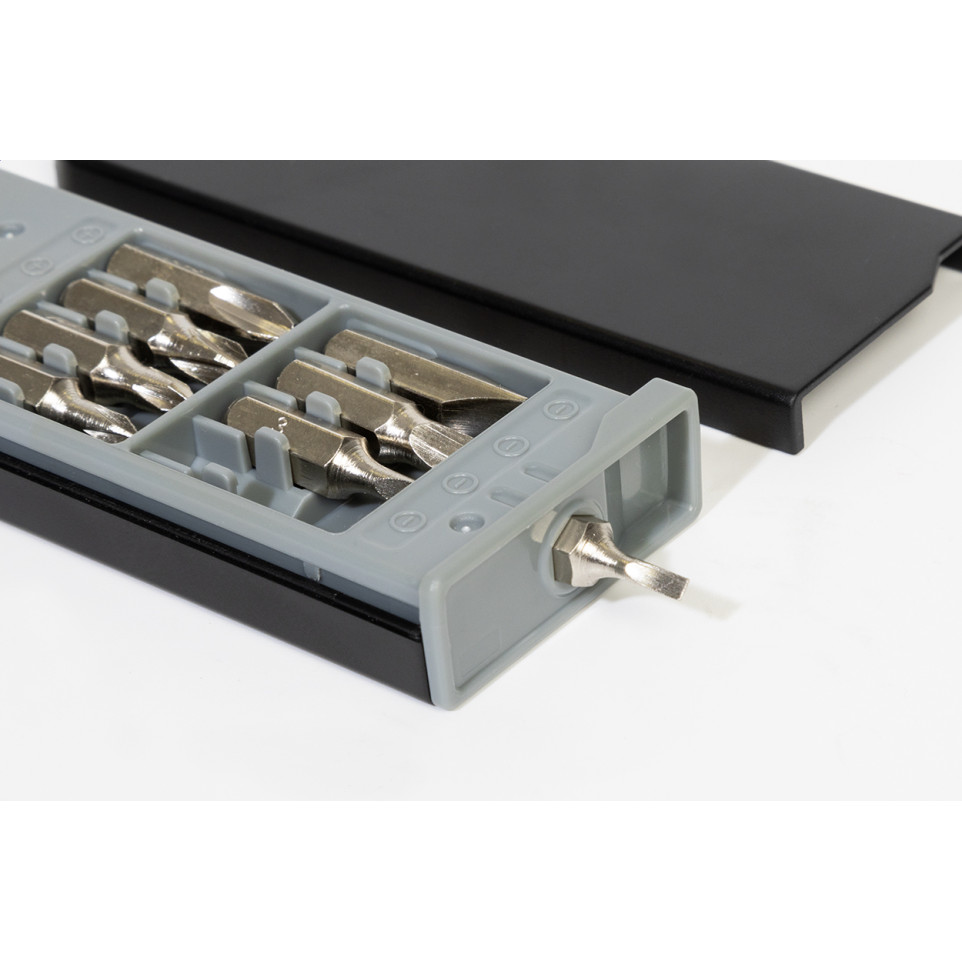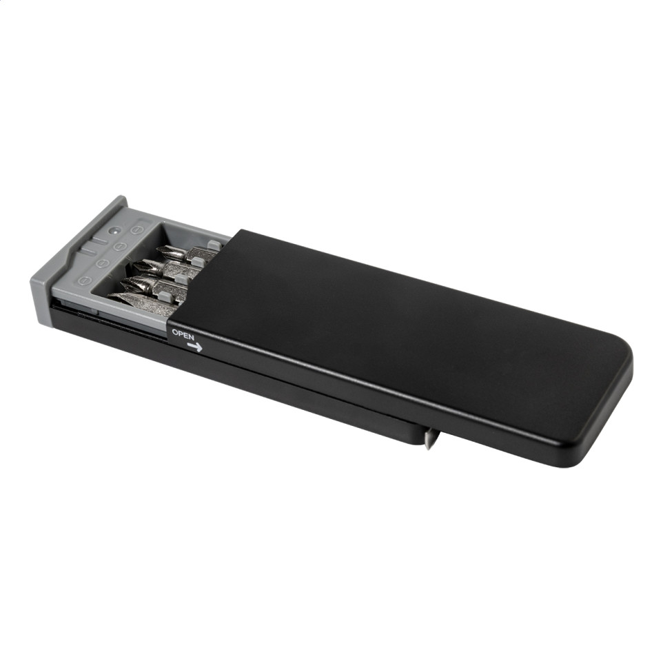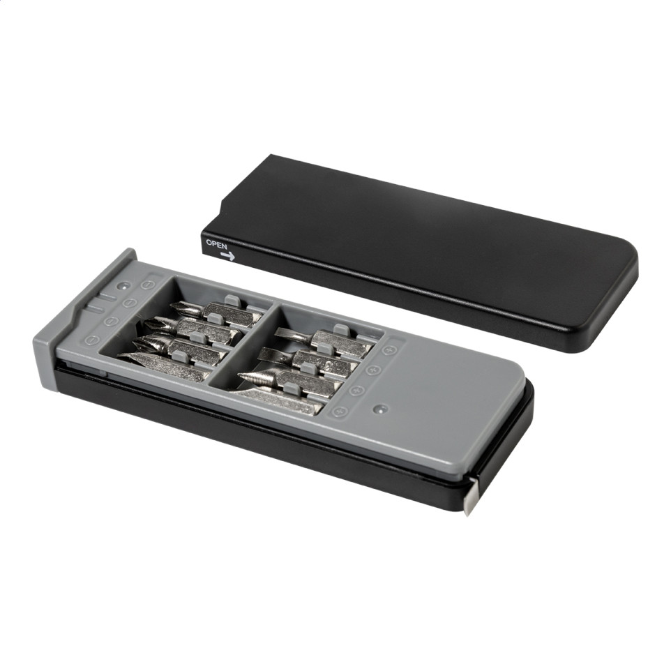 Compact Drawbit black RABS tool set (Ref: AP800805-10) in a recycled ABS case, featuring 8 screwdriver bits and a built-in 1m tape measure. Ideal for quick repairs or everyday tasks on the go, with dimensions of 107x40x14 mm.[1][2]
