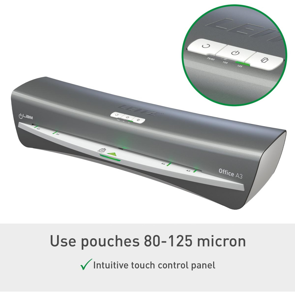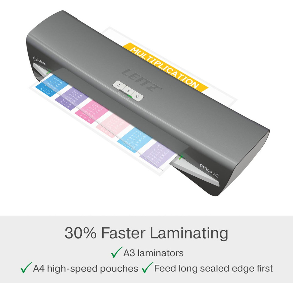 The Leitz iLAM Office A3 laminating machine is designed for quick and reliable lamination of documents up to A3 size, ideal for office environments needing frequent document protection and presentation.
