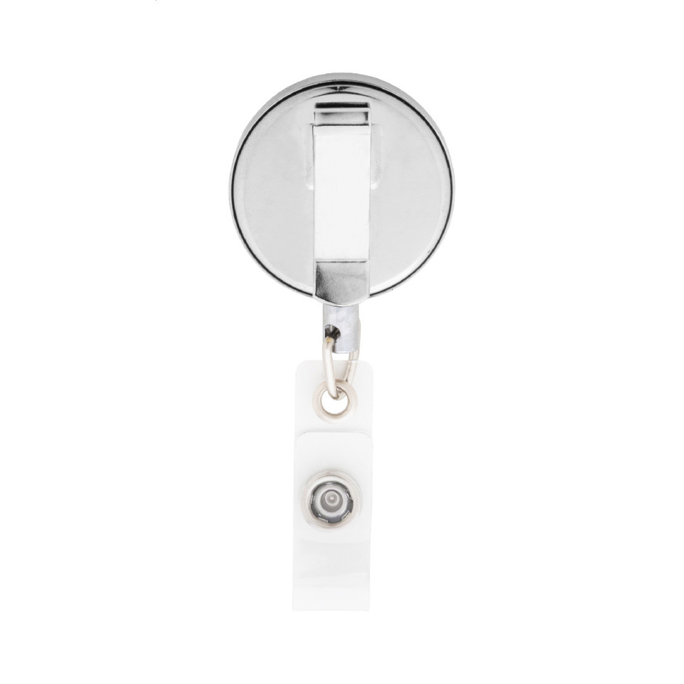 The metal clip is designed for secure attachment to both lanyards and garments.