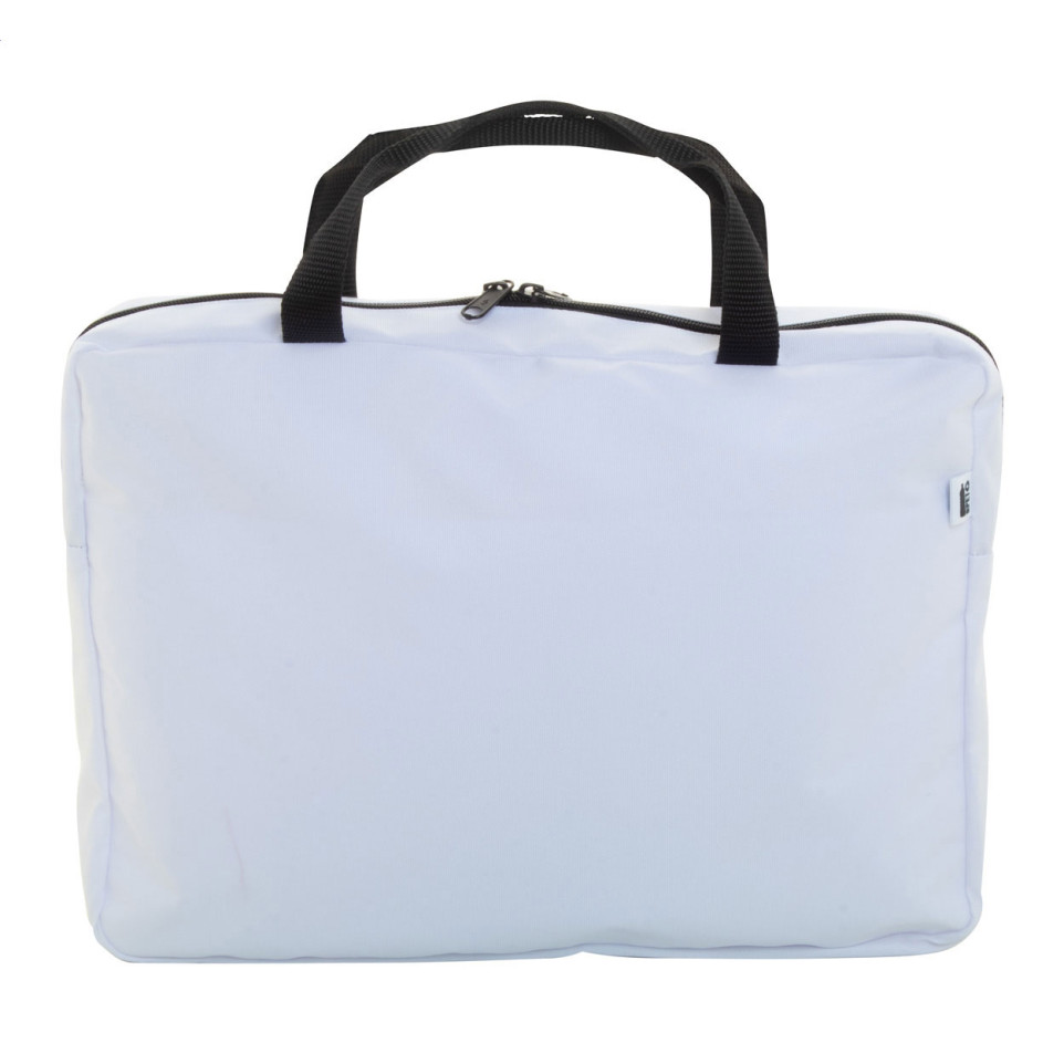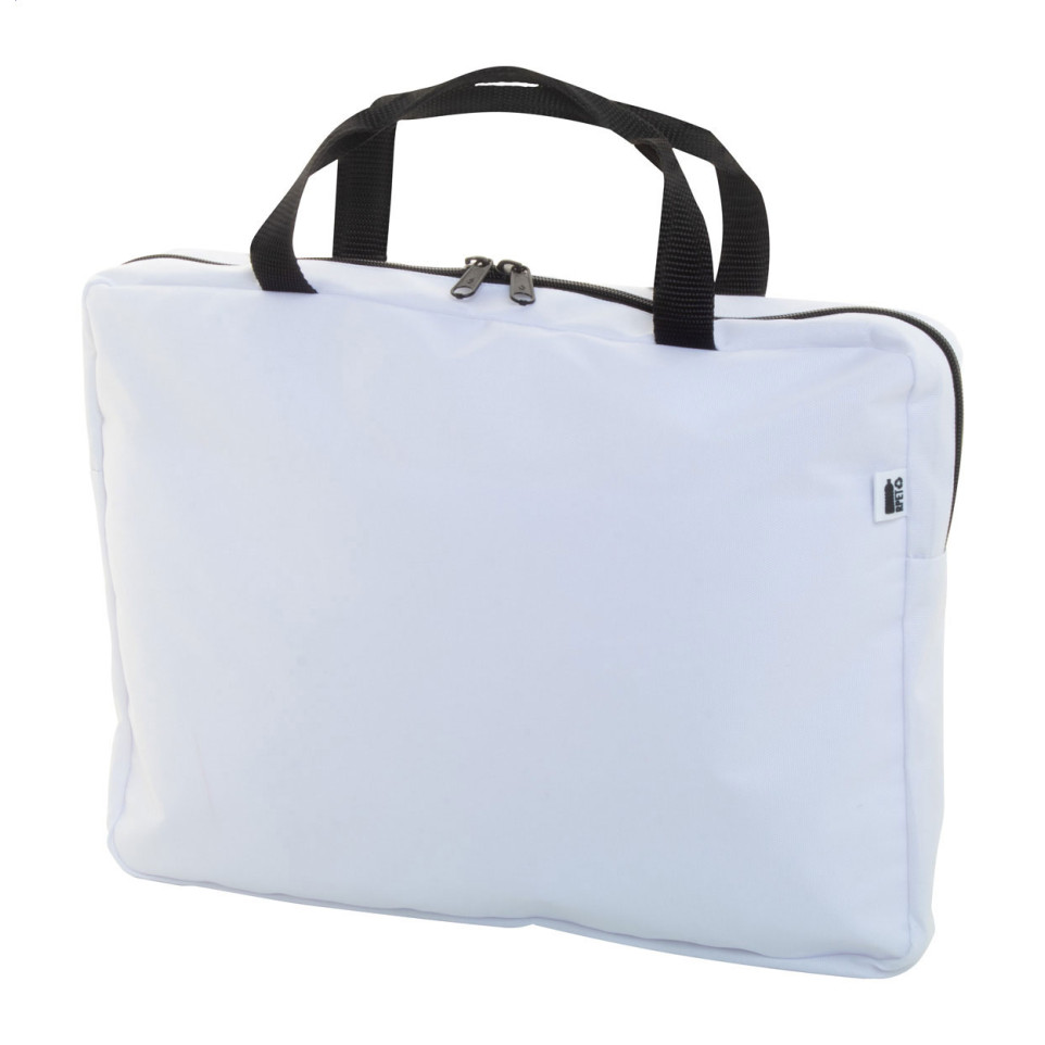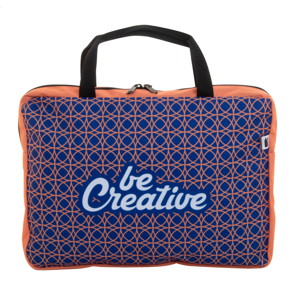 The SuboBag Docu is a custom-designed document bag featuring black and white sublimation printing. Made from recycled materials, it offers a spacious compartment for laptops up to 15" with secure zipper closure, perfect for professionals on the go.