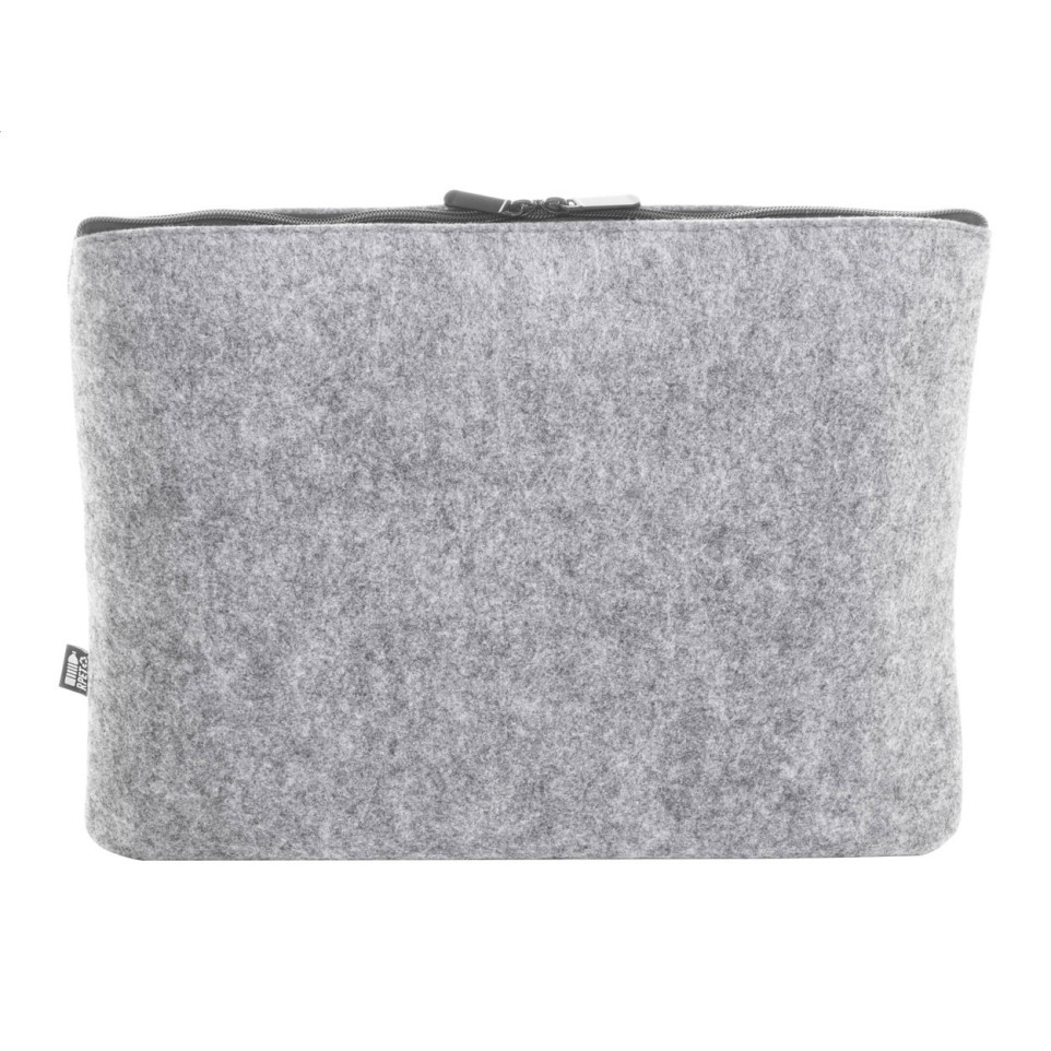The Refelt Comp grey RPET felt laptop bag is a sustainable carrying solution featuring a main zipped compartment and convenient front pocket, designed to fit laptops up to 15". Each bag comes with a distinctive RPET label showcasing its eco-friendly credentials.