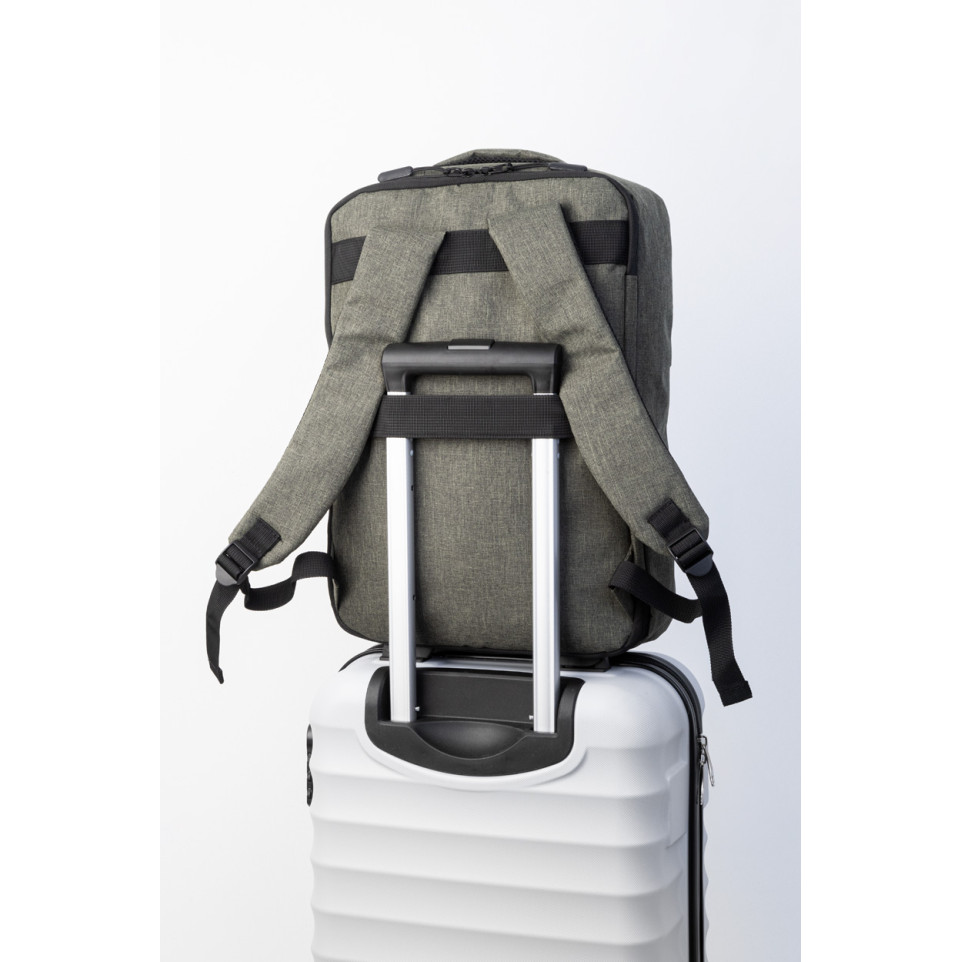 What is a trolley strap and how does it work? The trolley strap is a band on the back of the backpack that slides over the handle of a rolling suitcase, allowing you to secure the backpack to your luggage for easier transport through airports or train stations.