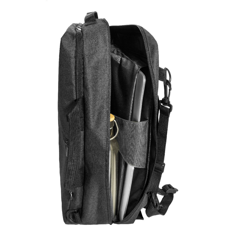 Versatile black RPET backpack and document bag designed to carry laptops up to 15 inches, featuring zipped compartments and options for both backpack and briefcase-style use with a detachable shoulder strap. Ideal for professionals needing organized, flexible transport for documents and tech.