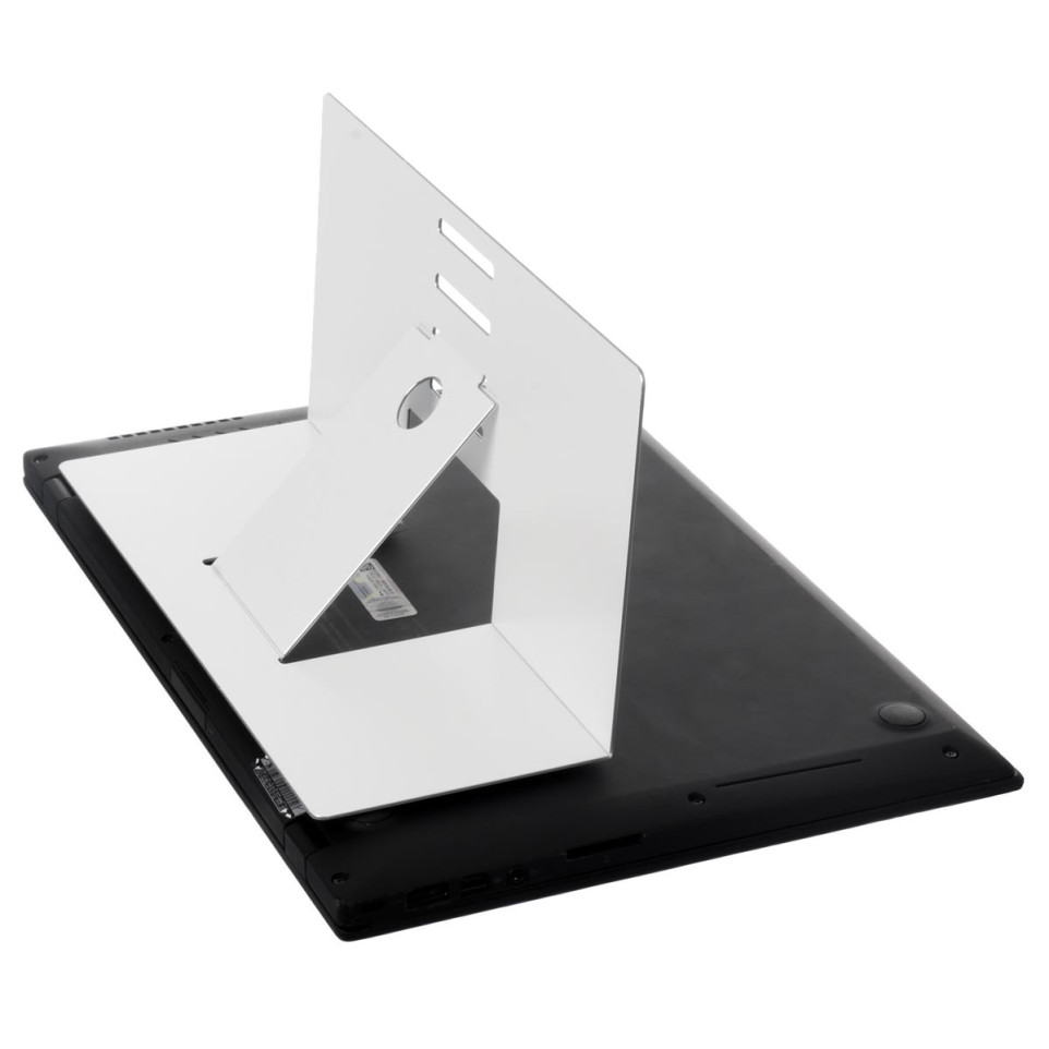 The stand mounts permanently on the back of your laptop using Velcro strips. When needed, unfold the support and select one of four height positions to raise your screen comfortably—helping maintain proper ergonomic alignment in any location.[1][5]