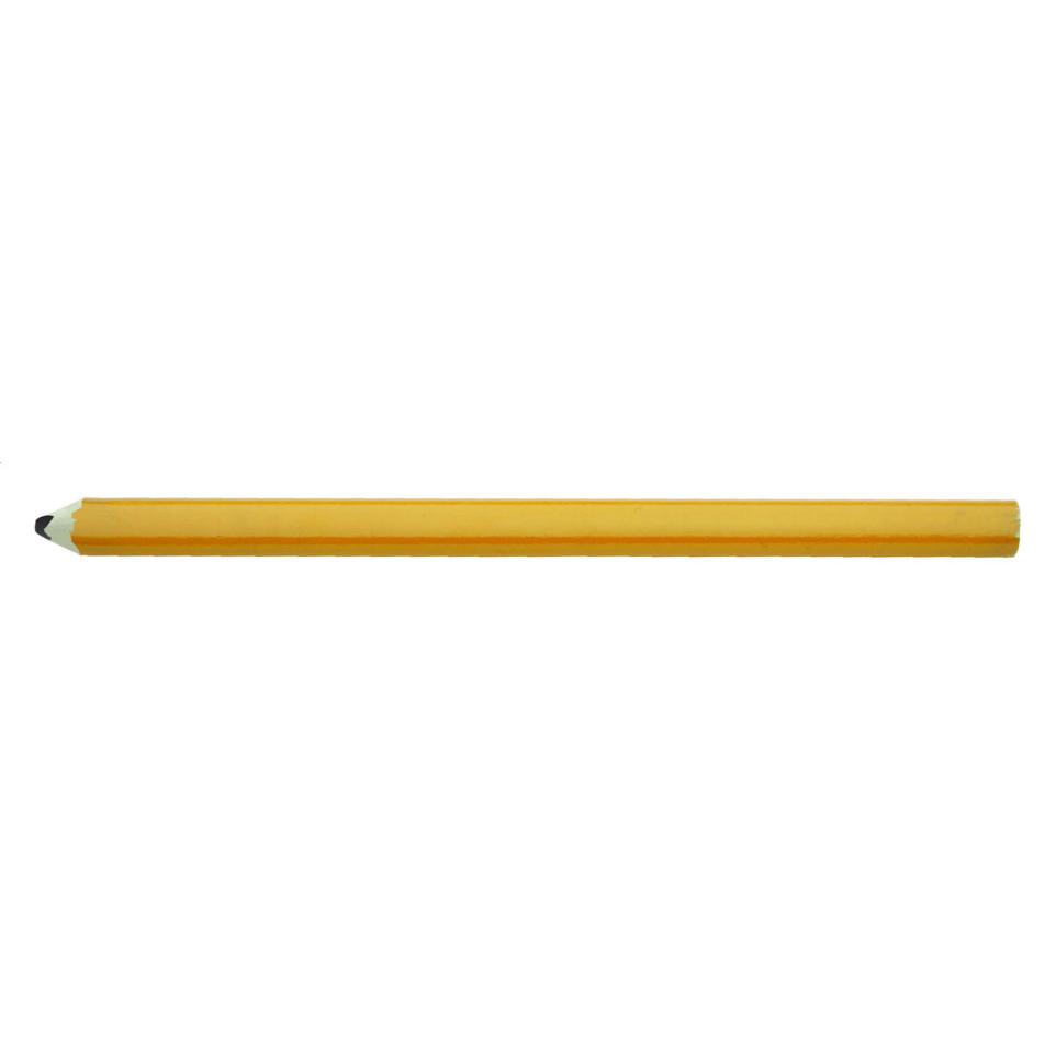 Yellow wooden carpenter pencil, unsharpened. Designed for marking on rough surfaces such as wood, plaster, or stone, it is an essential tool for professionals and hobbyists in construction, woodworking, and DIY.