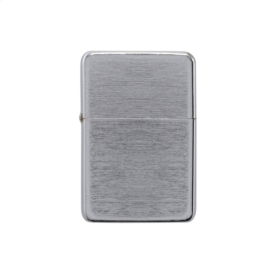 Refillable metal gasoline flint lighter with a brushed silver surface, delivered unfilled. Ideal for daily personal or promotional use. Only available in full export carton quantities (360 pieces).