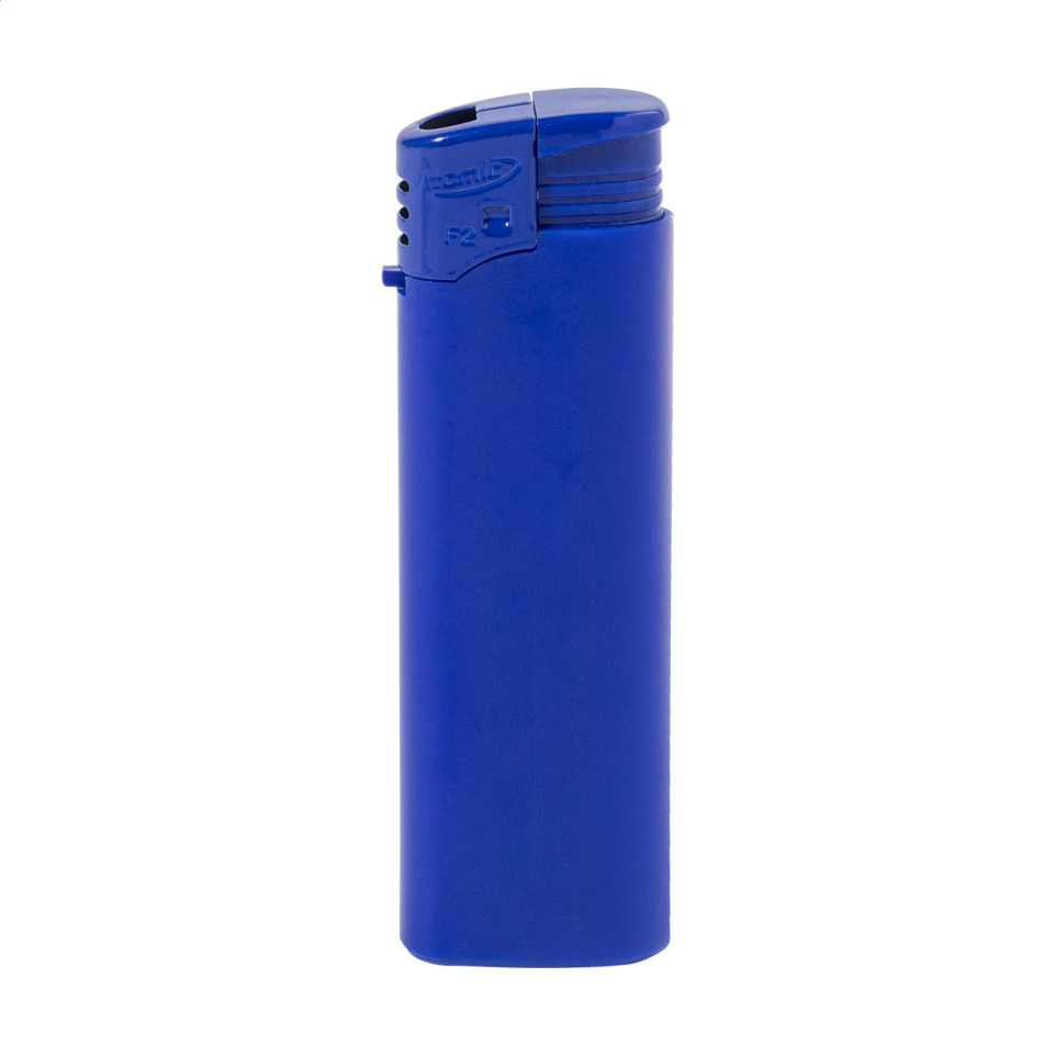 Refillable plastic piezo lighter in light blue, reference AP717021-06. Child resistant design ensures safe use. Delivered with approximately 80% gas level for immediate reliability in everyday or promotional applications.