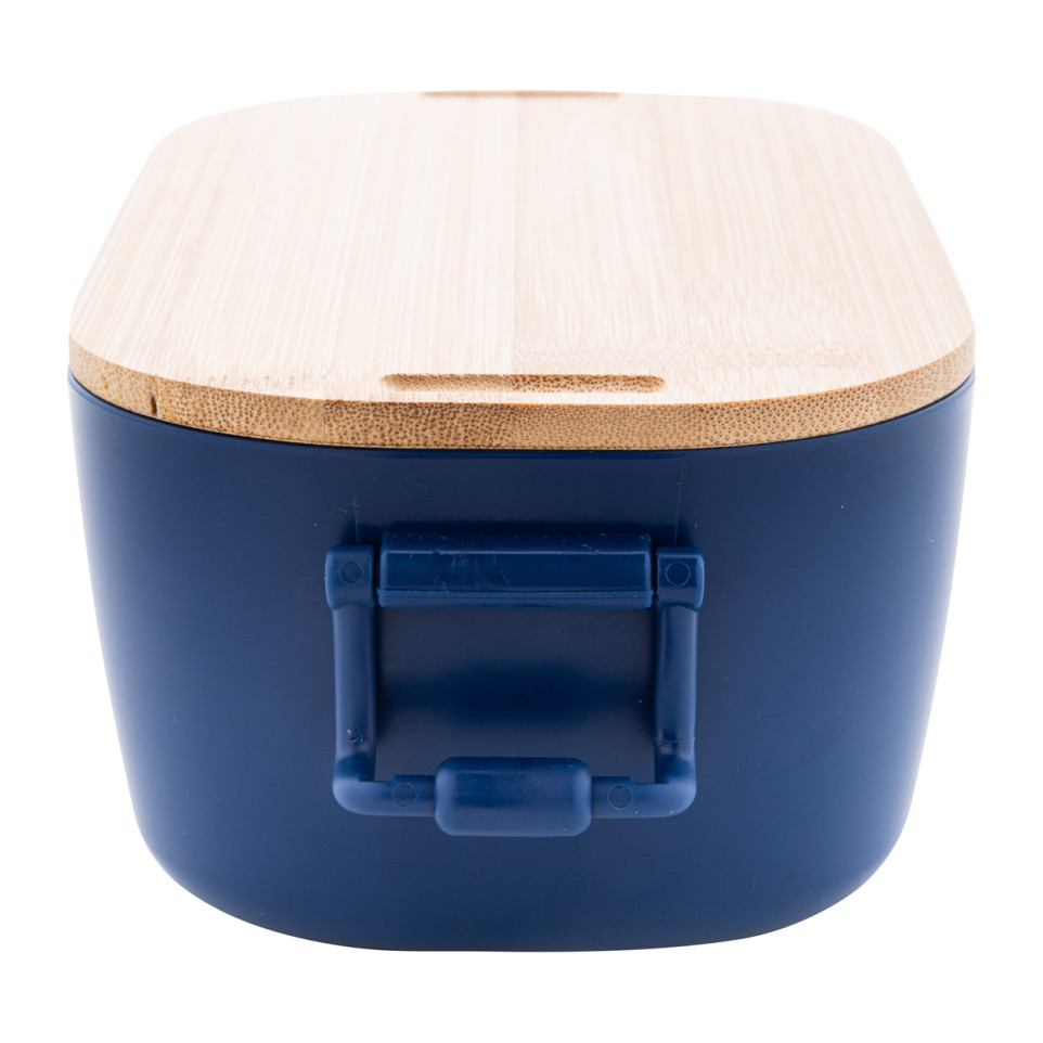 The Fuboo dark blue lunch box is a sleek, eco-friendly food container featuring a stylish bamboo lid and secure buckle closure system, perfect for transporting meals to work, school, or outdoor activities.