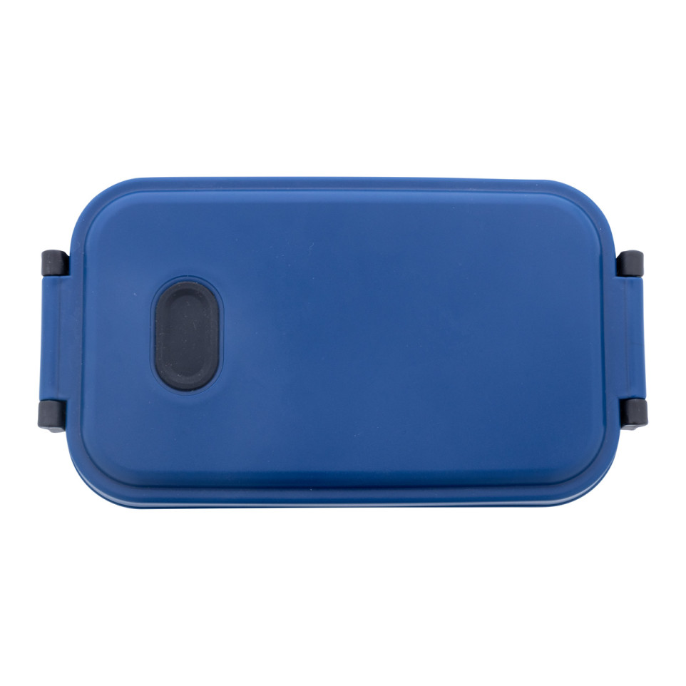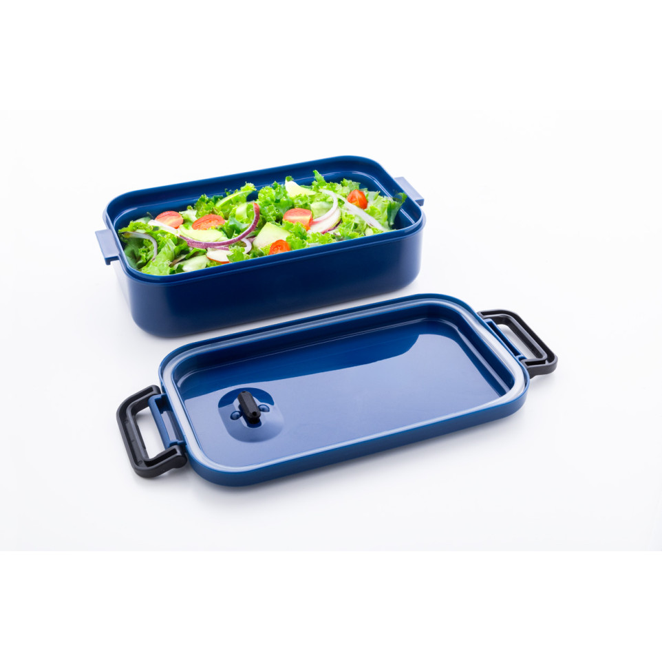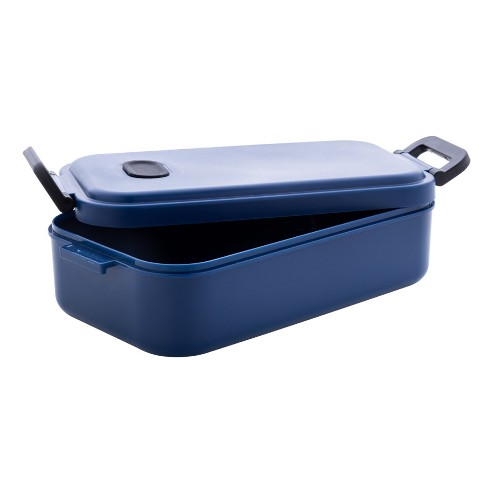 A practical dark blue lunch box made of PP plastic with a secure airtight lid, silicone valve, and convenient buckle closure. Perfect for taking meals to work, school, or outdoor activities with its generous 1000ml capacity.