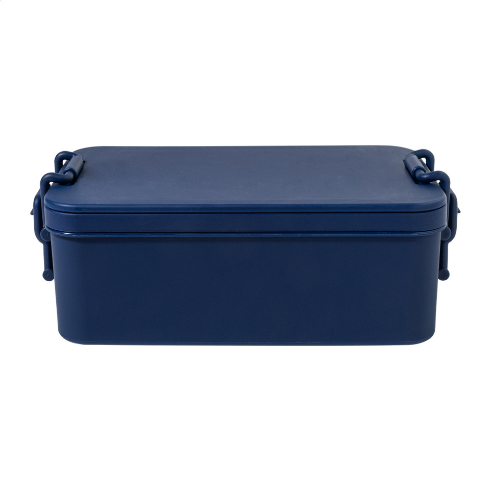 Duplox dark blue stackable lunch box with integrated cutlery set, dual compartments, and secure buckle closure. Designed for convenient meal transport and storage in professional and personal settings.