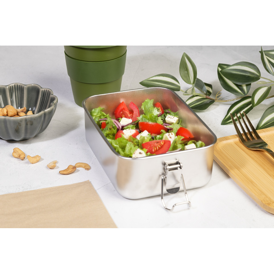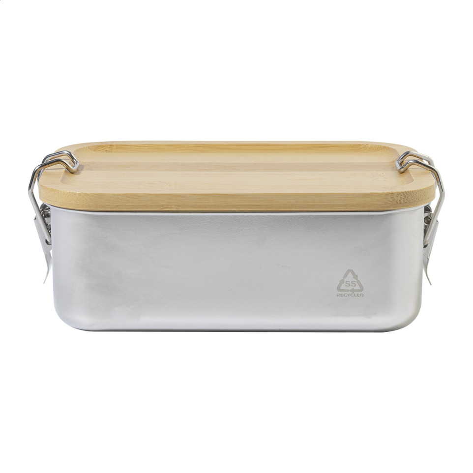 Motetsu silver natural RSS lunch box is a 750 ml recycled stainless steel container with a bamboo lid and secure buckle closure, ideal for packing meals on the go or at the office.