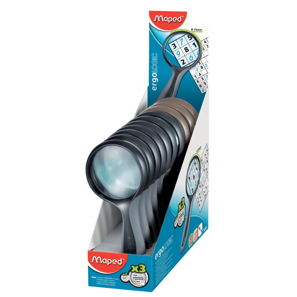 The Maped loupe présentoir provides 3x magnification.