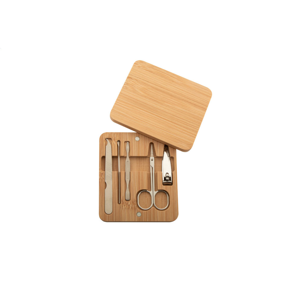 Can the manicure set be customized with a company logo? Yes, the bamboo surface can be customized with your company logo or message, making it an excellent promotional item that combines practicality with brand visibility.