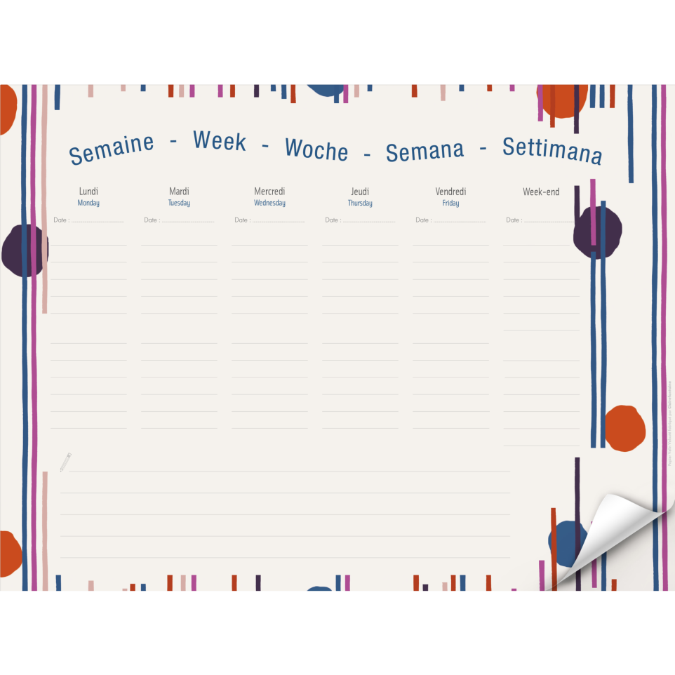 Punchy line, Semainier, bloc encollé en entête, 55 feuilles détacheables, 30 x 40 cm Pour cette deuxième collaboration avec Clairfontaine, l'Atelier LZC aux créations empruntes de poésie, de mélanges de couleurs dans un esprit libre, a décliné sur toute une gamme de papeterie un graphisme inédit, vitaminé appelé Punchy Line. Pois et rayures irréguliers, jeux d'échelle et rapport de couleur spontanés viennent animer votre quotidien. Comme un rayon de soleil, cette collection vous accompagnera tout au long de l'année. 1 visuel motifs géométriques Finition vernis sur motifs pour un beau rendu