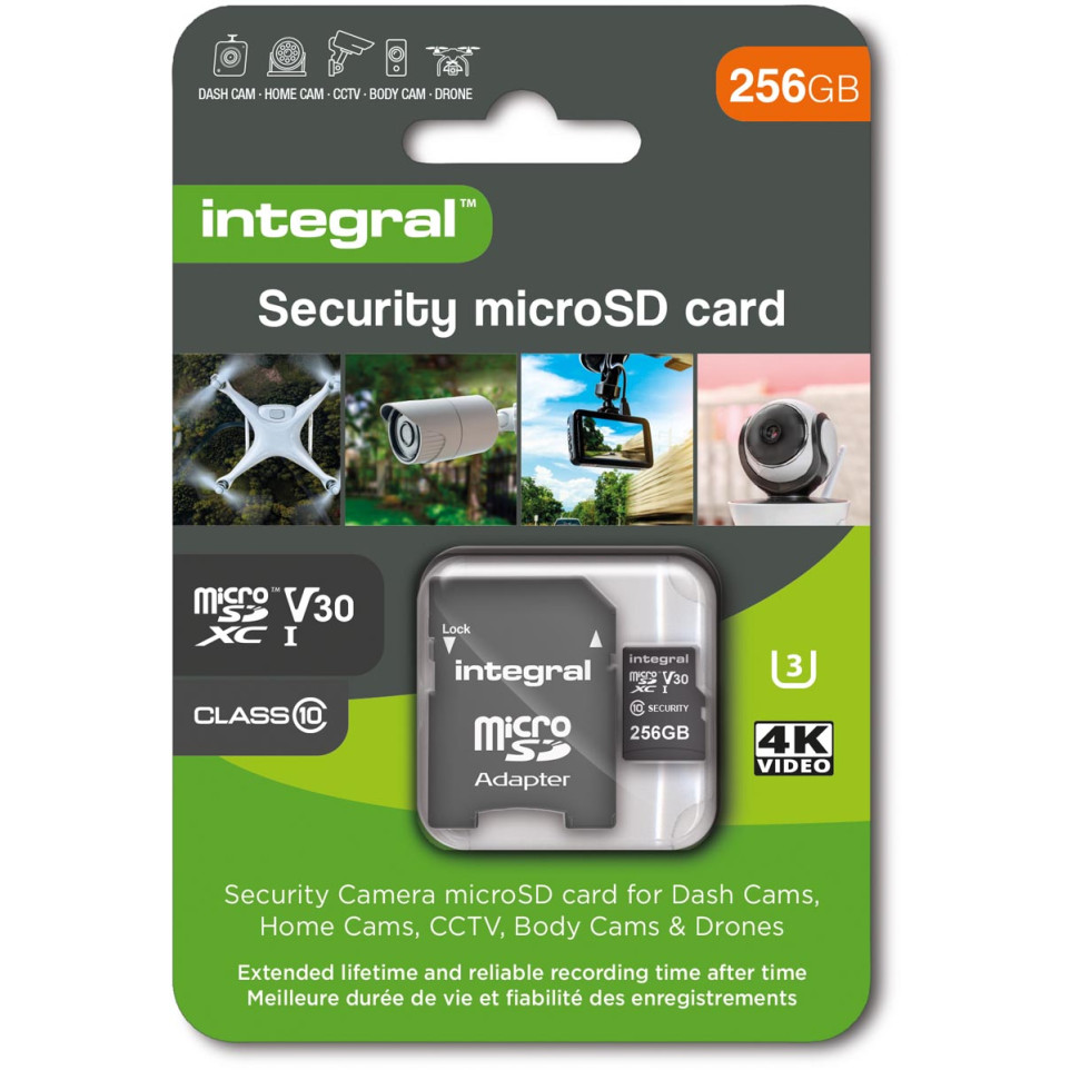 Integral Security 256GB microSDXC is designed for high-demand devices such as security cameras and drones. It offers fast read and write speeds, making it suitable for 4K Ultra HD recording and large data storage.