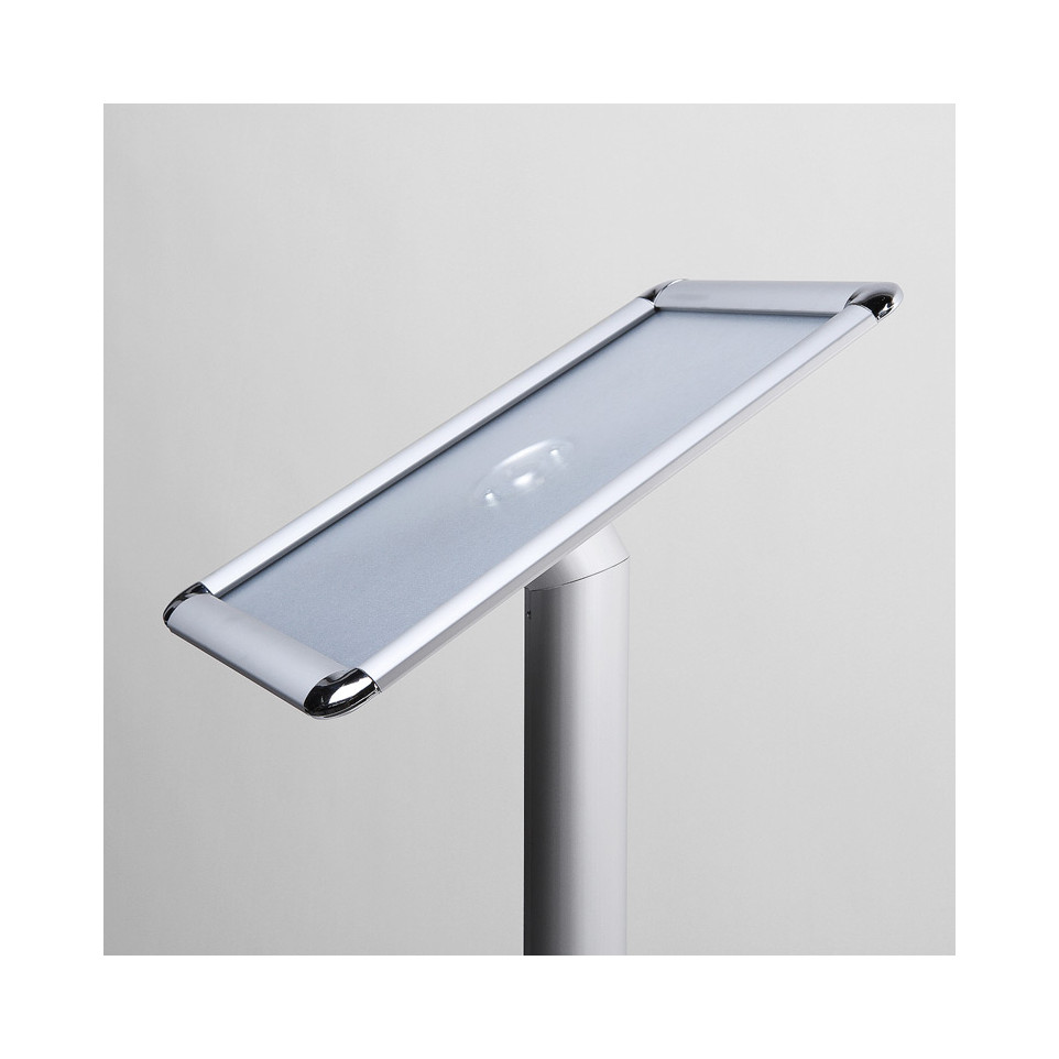 AdvantagesThe menu board features an easy-to-use snap-open frame. Simply lift the edges of the frame, insert your A3-size poster behind the anti-glare cover, snap it closed securely in place, and position as needed on stable surfaces using its sturdy base design.
