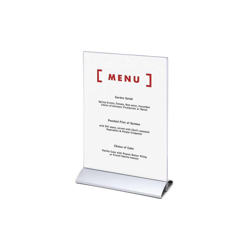 Insert your A4 menu or promotional sheet into the clear acrylic holder and place the unit on tables or counters. The design allows for fast sheet changes without tools, providing an efficient way to refresh content. Suitable for use in restaurants, hotels, offices, or displays where menu or information visibility is important.