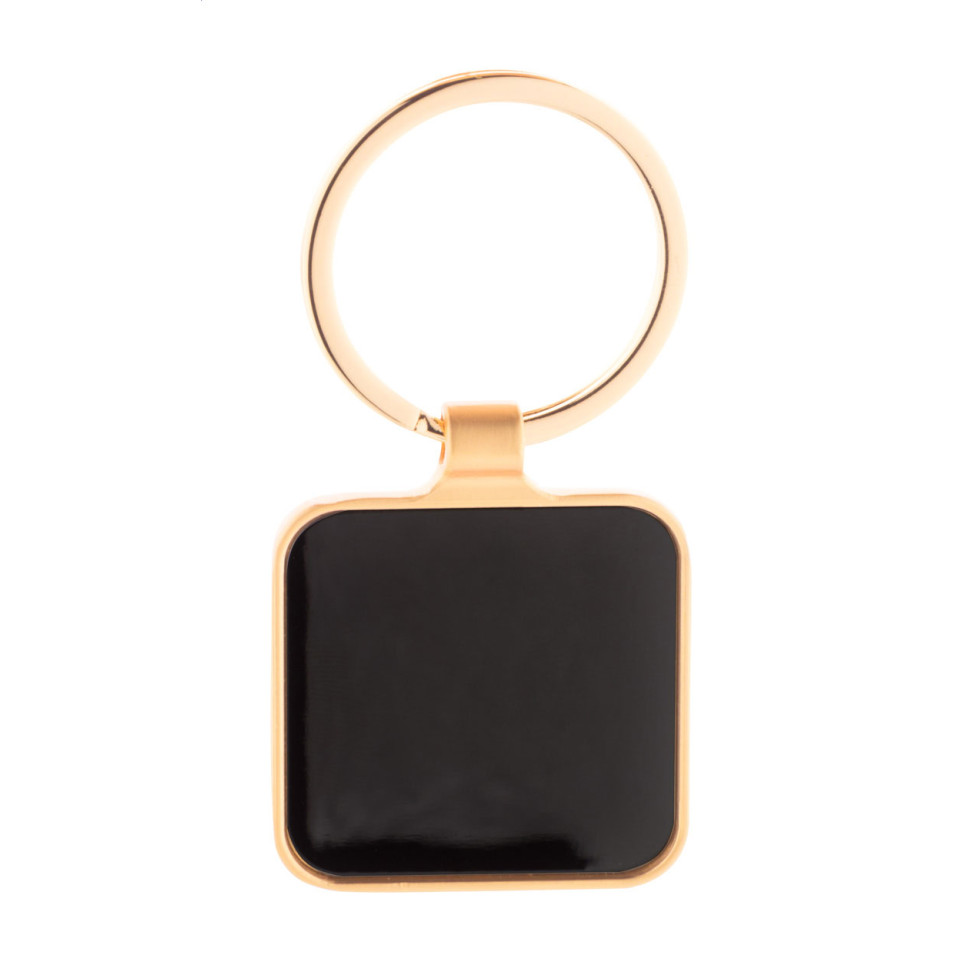Square-shaped metal keyring in a golden finish with a contrasting gunmetal plate. Presented in a kraft paper box, it is designed for everyday use, offering a stylish and practical way to organize and carry keys.
