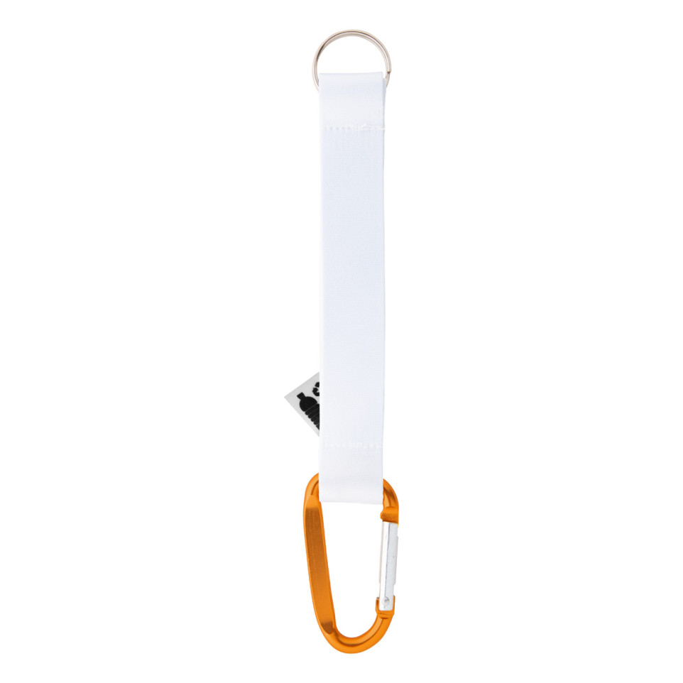 Custom-made Subiner keyring, orange and white, crafted from recycled PET polyester with sublimation-printed graphics on both sides. Equipped with an interior RPET label, a recycled aluminium carabiner, and a metal ring for versatile everyday use.