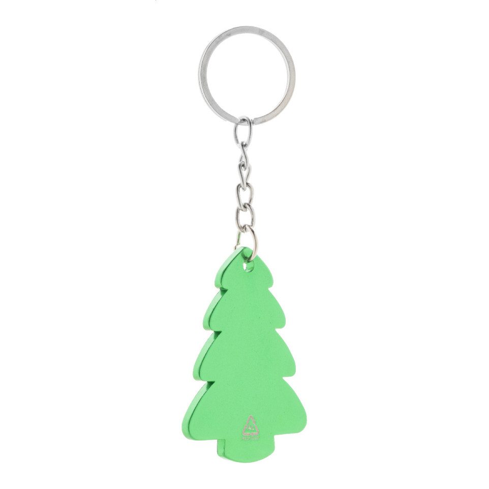 Christmas tree-shaped keyring crafted from recycled aluminium, featuring a vibrant green finish and a sturdy metal ring. Ideal for everyday use or seasonal gifting.