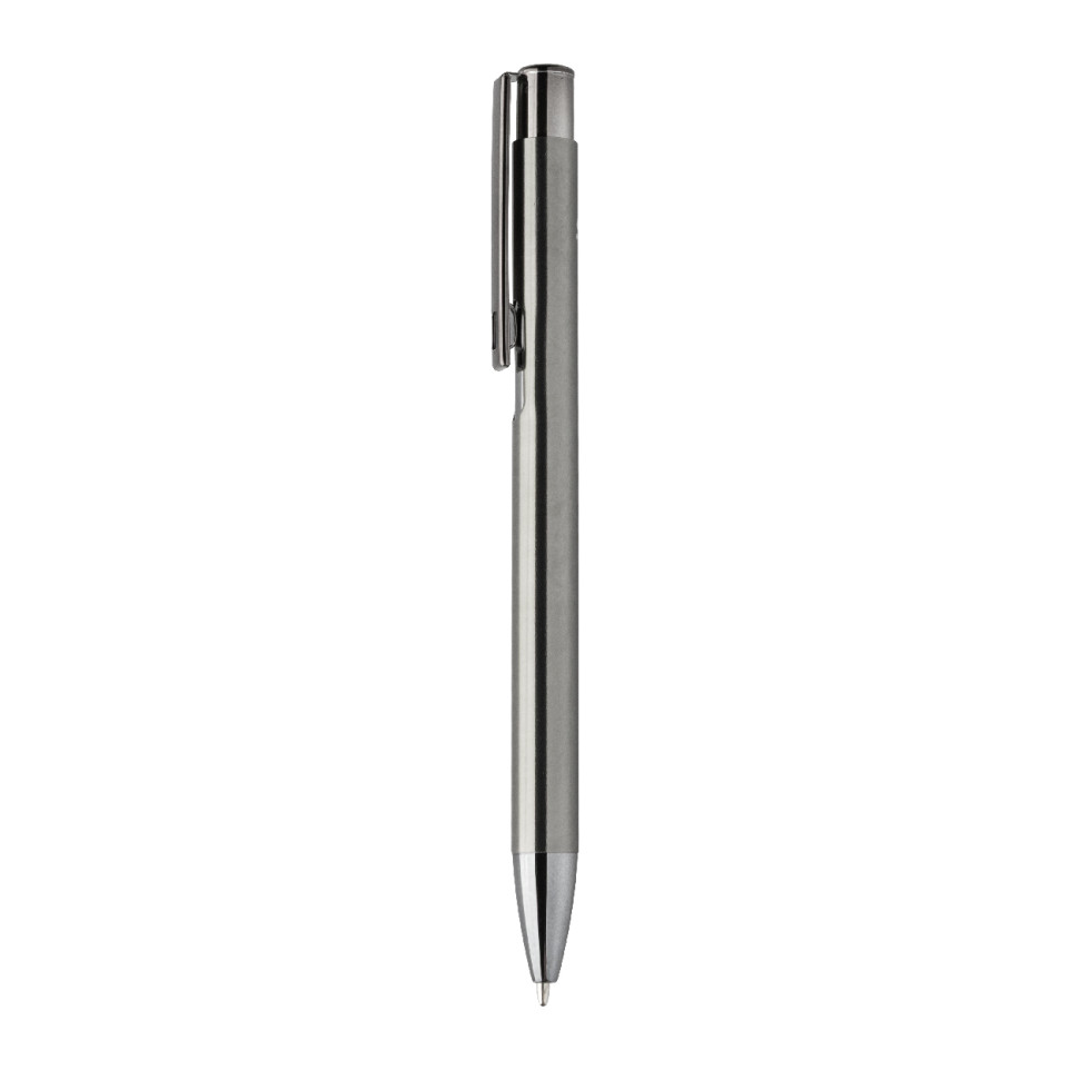 The pen is made from recycled aluminium with a shiny metallic finish.